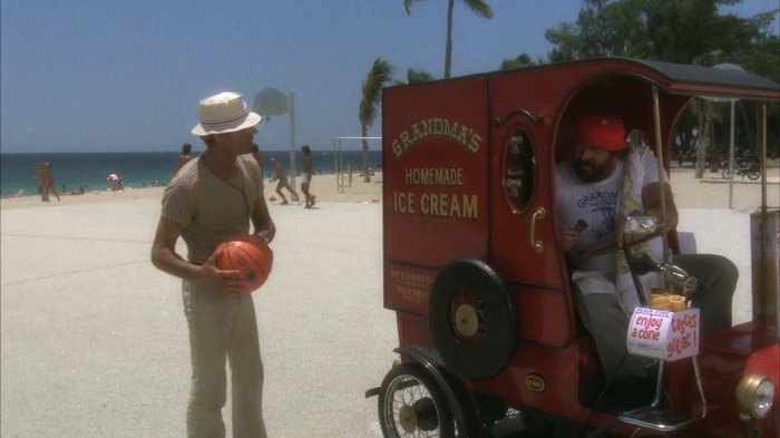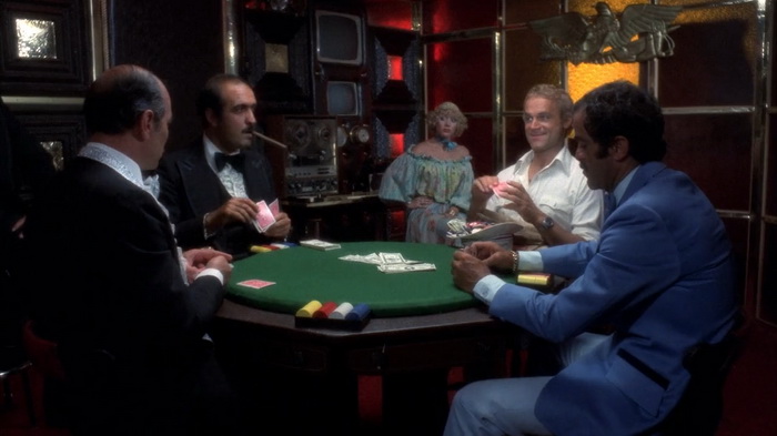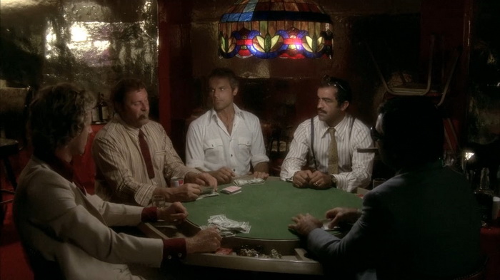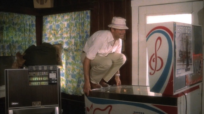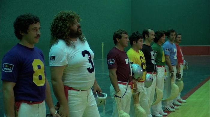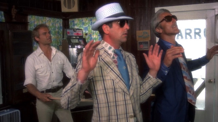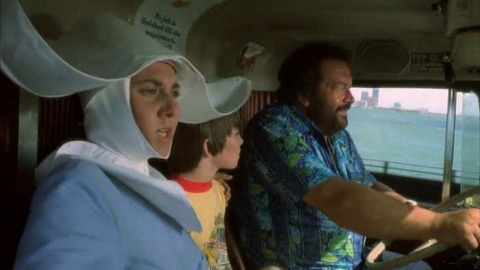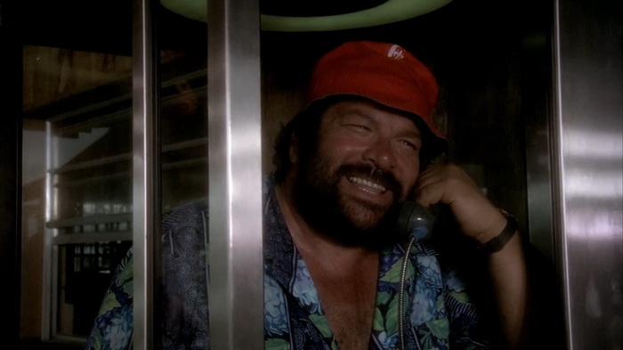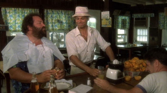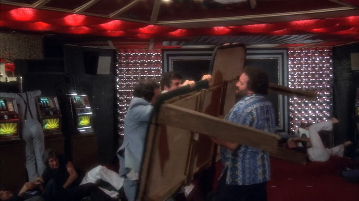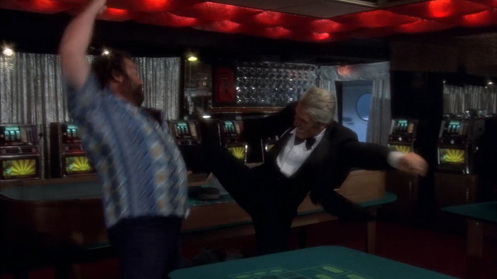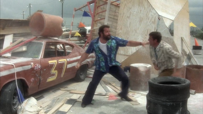 Pour le reste, c’est pareil, du grand classique pour qui aime ces films. On a donc des gags bien gros mais qui marchent toujours, un humour bon enfant qui contraste avec certains dialogues grossiers (« rien à foutre », « presse-burette », « tortiller du croupion », …), un thème musical entêtant, avec en prime ce coup-ci pas mal de séquences sportives très sympathiques : Football américain, course hippique, stock-car, et même de la pelote basque (oui oui, en Floride, avec un public hallucinant). Et bien entendu des bagarres au style inimitable avec ce que cela comporte de claques aux bruitages bien exagérés, de dents qui tombent, de cascadeurs qui passent à travers les murs et de combats improvisés avec tout ce qui leur passe par la main : poêle, planches en bois, roulettes de casino, queues de billard et même une table de poker. Assez nombreuses dans la première moitié, Pair et Impair se montre un peu plus avare en bastons dans sa deuxième partie mais se rattrape aisément par son long final absolument jouissif. Alors c’est certain, le scénario est simpliste et n’apporte que peu de surprises. On ne compte plus le nombre de faux raccords, plus particulièrement lors des bagarres où certains cascadeurs apparaissent dans deux plans consécutifs mais dans des lieux différents. Mais qu’importe, quand on sait d’entrée de jeu dans quoi on se lance, on passe outre immédiatement et on retombe en enfance devant ce plaisir coupable qu’est Pair et Impair.