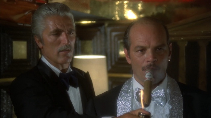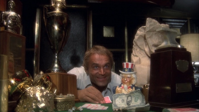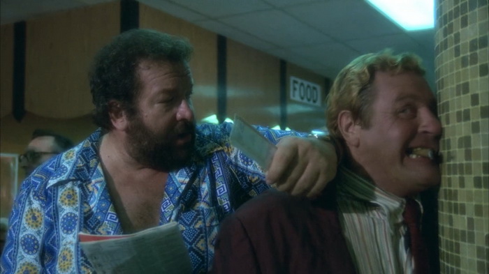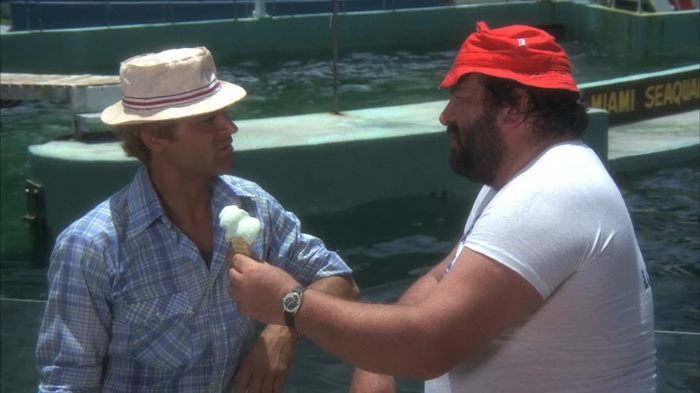 Premier film du duo pour le réalisateur Sergio Corbucci (Django, Le Grand Silence), qui réalisera pour eux par la suite Un Drôle de Flic (1980) et Salut l’Ami Adieu le Trésor (1981), Pair et Impair va reprendre la recette qui a fait le succès des films de Bud Spencer et Terence Hill. Le film va de nouveau jouer sur un duo que tout oppose, ne se connaissant pas au départ mais qui vont finir par collaborer. Bud Spencer est un as du jeu mais qui ne veut plus jouer et qui s’est recyclé dans le transport de dauphins vivants, un ronchon balourd mais au grand cœur, et Terence Hill récidive avec son rôle de roublard malin, dragueur, et un peu fouteur de merde. Un duo avec toujours un aussi gros charisme. A leur côté, toujours l’équipe de cascadeurs de Riccardo Pizzuti, avec ses acteurs aux cabines mémorables (Sal Borgese, Giancarlo Bastianoni, Claudio Ruffini) qui se donnent à fond. Tellement à fond que Riccardo Pizzuti sortira du tournage avec deux côtes et deux molaires cassées. Merci Bud et Terence ! Comme souvent, on retrouve également des clins d’œil aux films précédents du duo : les fayots (On l’appelle Trinita), la course de voiture (Attention on va s’fâcher), un pari stupide d’ingurgitation de jus d’orange (celui des saucisses dans Attention on va s’fâcher), la démolition complète d’un restaurant (Attention on va s’fâcher, Deux Super Flics), et bien d’autres… Autant vous dire qu’on est en terrain connu et que le sourire va très rapidement monter jusqu’aux oreilles de l’inconditionnel.