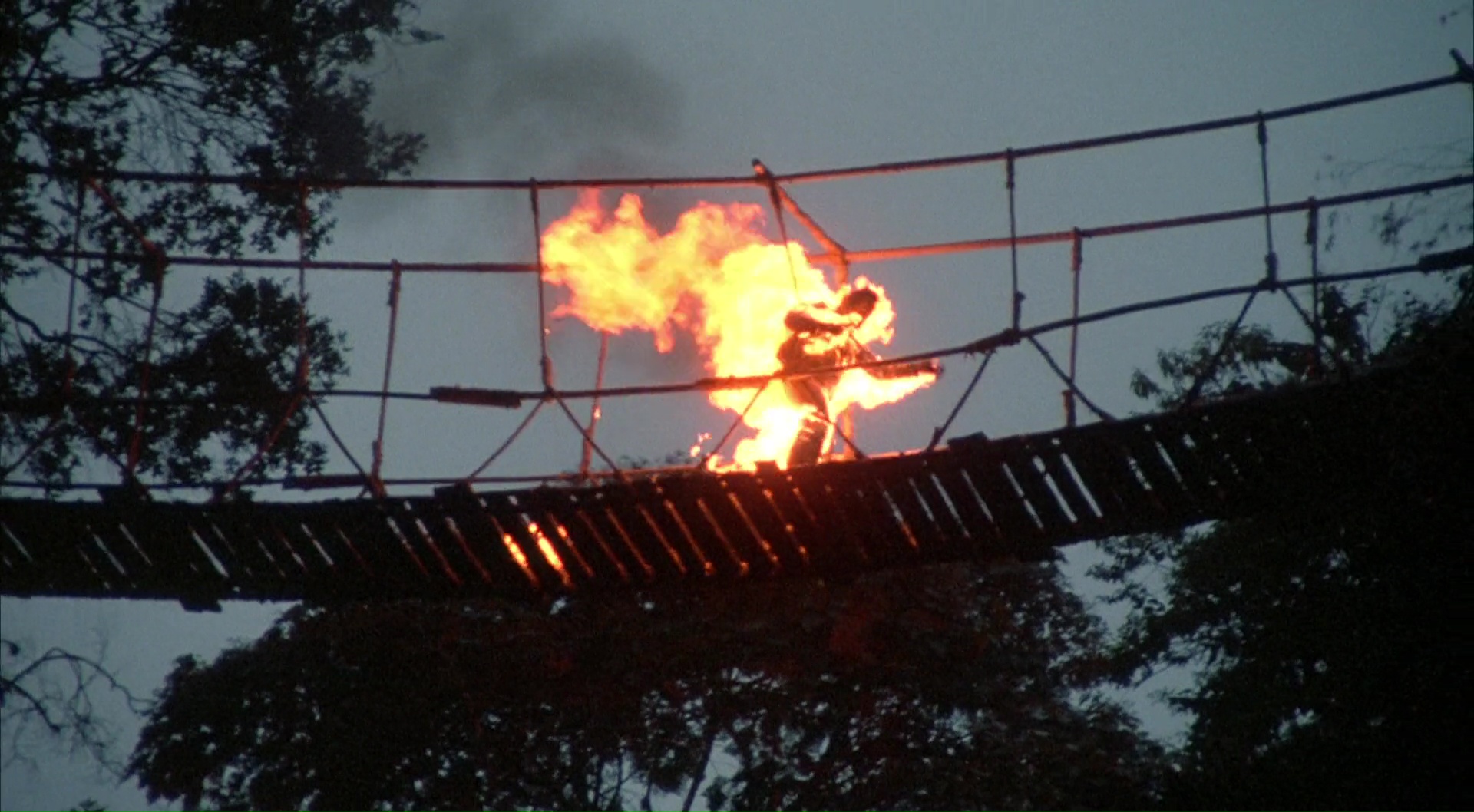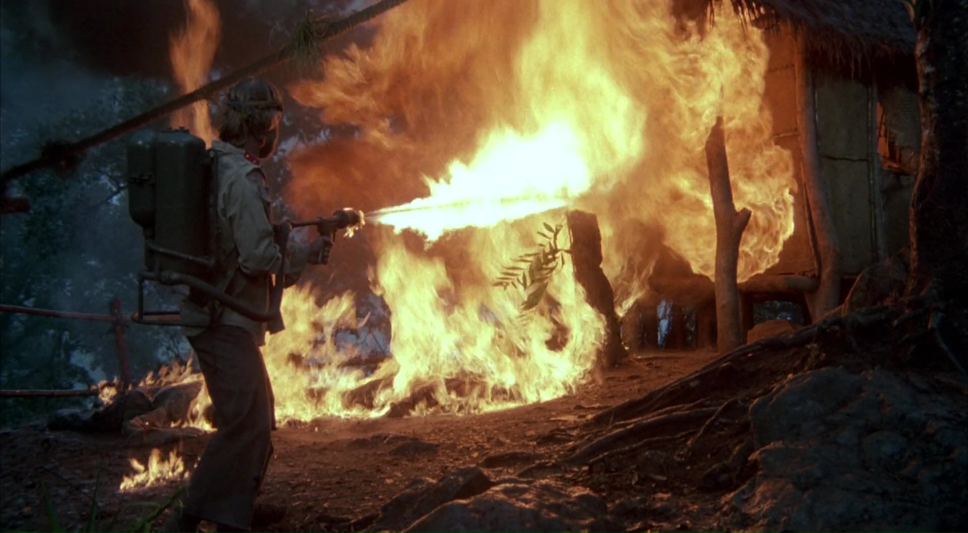 Dans un premier temps, l’évasion donc. Plutôt sympathique et rondement menée, avec un Chuck qui se la joue discret. Le passage du pont est très bien trouvé par exemple. Bien qu’un peu court, c’est avant tout pour laisser après le devant de la scène à l’action, car Chuck ne peut pas laisser l’ennemi impuni et laisser les siens derrière. Donc là, ça mitraille, ça brûle car oui, il y a un lance flamme, ça utilise de la grenade, ça fait tomber des mannequins en mousse du haut des falaises, le tout pour notre plus grand plaisir. Au diable la logique et la subtilité, il faut tout faire péter dans un spectacle pyrotechnique où le héros ressort vainqueur, après avoir si possible ridiculisé le chef ennemi lors d’un combat à mains nues avec coups de tatanes dans la face. Un combat d’ailleurs plutôt sympathique, mettant en avant toute la générosité du métrage pour donner un spectacle varié aux spectateurs. C’est bien entendu blindé d’idéologie typique de son époque, c’est bis au possible à chaque instant, mais c’est clairement plus généreux que le premier film, moins bavard aussi, plus prenant. Certains clichés amusent (le général trafiquant d’opium, qui travaille avec un trafiquant Français bien entendu), comme certaines scènes mettant en avant la puissance de Chuck, même lorsqu’il est prisonnier (la scène du rat ahah), et puis après ça se réveille et respecte le cahier de charge. Mais en étant plus équilibré, plus divertissant. Bon, avec tout ça, il me reste plus que le dernier opus de la trilogie à voir !