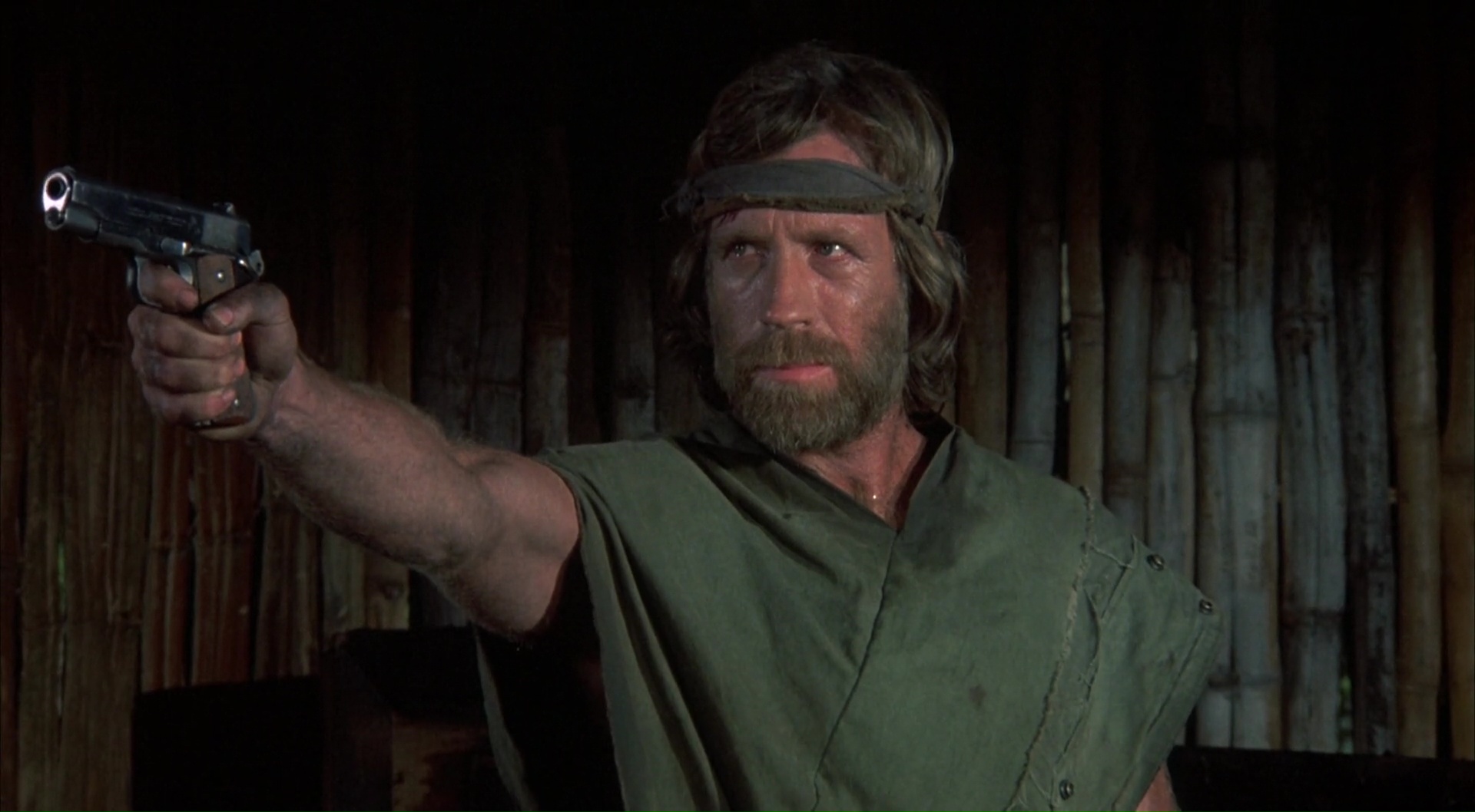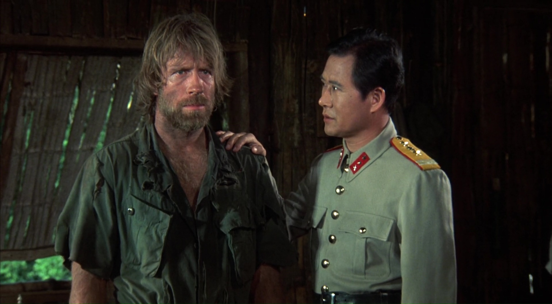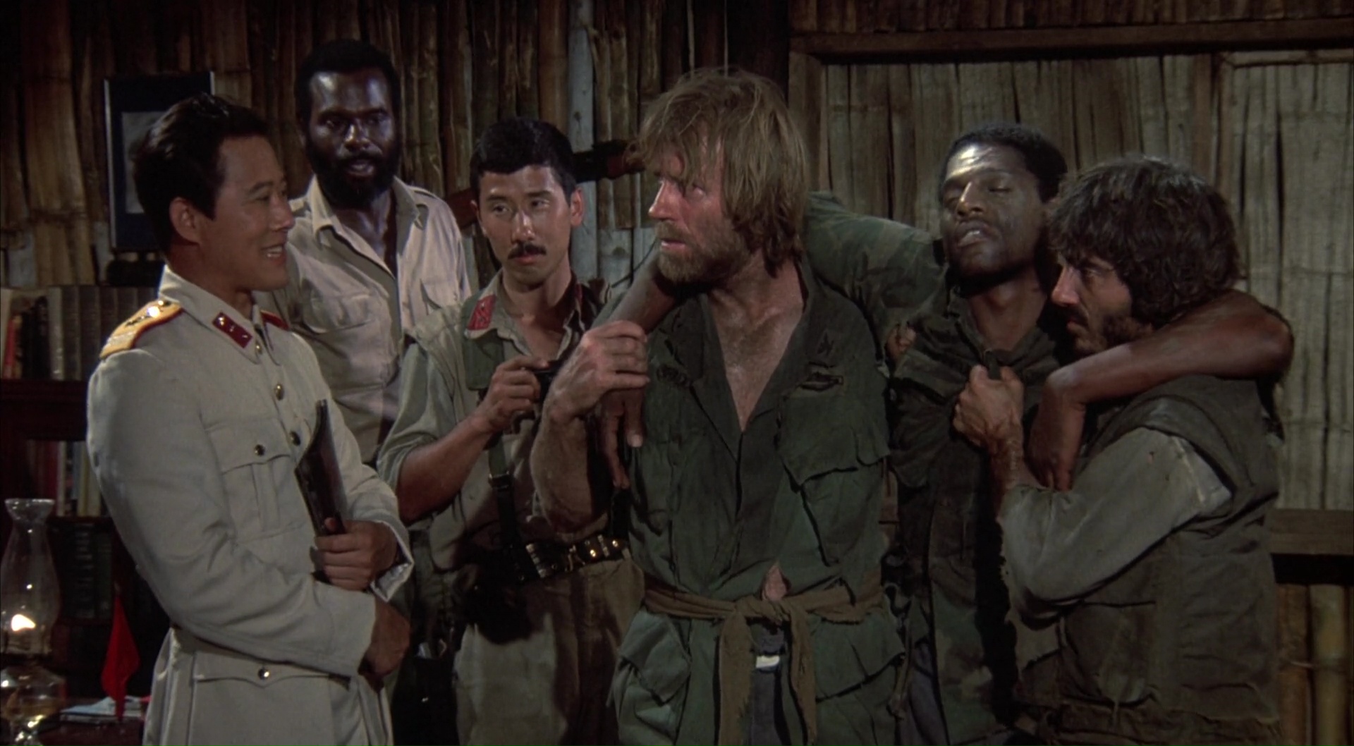 Bref, dés le générique, Chuck, enfin, Braddock donc, et son équipe sont capturés, et se retrouvent dans un petit village paumé géré par un général qui va torturer, physiquement et psychologiquement la fine équipe. Son but est de briser Braddock, et rien de plus. Pas d’échanges possibles, rien. Juste l’humilier, lui donner de faux espoirs, le voir au sol ne pas se relever. Mais c’est mal connaître Chuck, qui tient le coup, même quand son équipe passe l’arme à gauche. On aura droit aux mensonges, aux maltraitances par les gardiens, aux combats, aux tentatives de manipulations, aux faux espoirs avec la promesse d’un retour au Pays, à divers sévices physiques ainsi qu’au bien connu jeu de la roulette russe. Du classique, mais finalement plutôt bien mené, on ne s’ennuie pas une seconde devant le spectacle proposé (comparé au premier film), et même s’il est difficile d’avoir peur pour Chuck, il s’en sort plutôt bien ce coup-ci pour nous faire croire un minimum à son personnage. Et ça, c’est plutôt sympathique, et on ne s’y attend pas vraiment. Bien entendu, Portés Disparus 2 est et restera avant tout un film d’action de son époque, où les Américains vont finir par gagner, seuls contre tous quoi qu’il arrive. Une époque où le cinéma Américain voulait à tout prix exorciser l’échec du Vietnam et ses conséquences, en montrant l’Amérique et ses soldats victorieux. Du coup, après une heure en prison, une heure à souffrir, il est l’heure pour Chuck de s’évader, mais surtout, car ce ne serait pas drôle sinon, de se venger. Et là il n’y va pas avec le dos de la cuillère le Chuck, oh non.