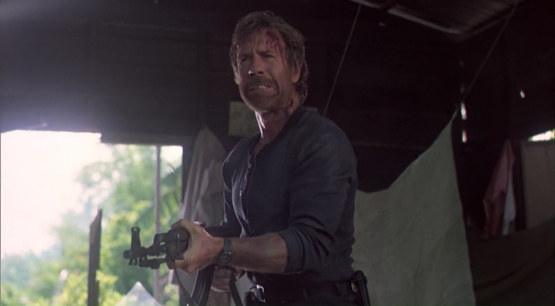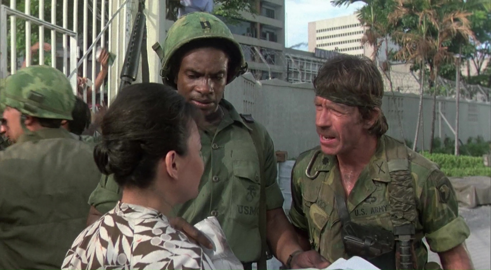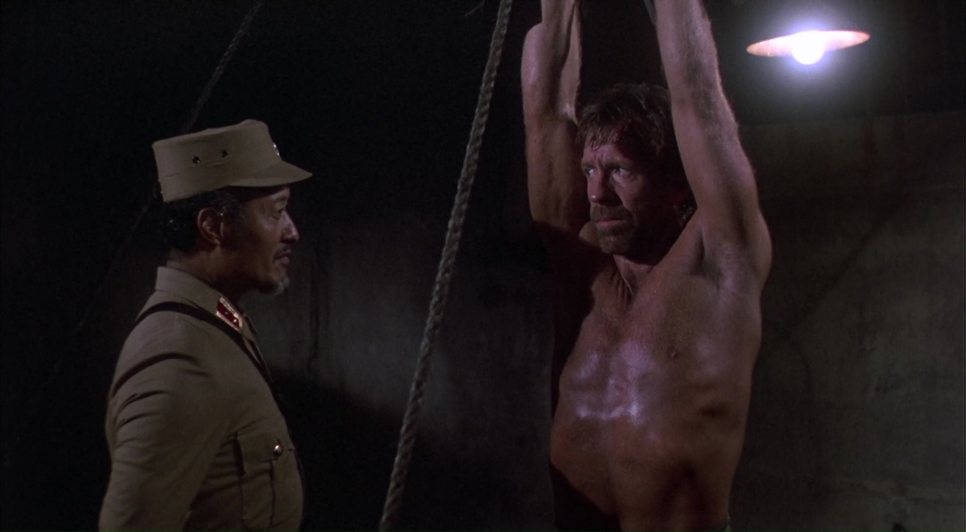 Du coup, pour la troisième fois, Braddock retourne au Vietnam, de sa propre initiative. Après avoir sauvé sa peau, après avoir sauvé les siens, le voilà de retour pour sauver son fils, sa femme, et par la même occasion, pas mal de gamins bloqués là-bas. Sans changer toutefois la formule. Un ami et agent lui apprend que sa femme est en vie et a eu un fils, qu’il faut les sauver, Little John (Jack Rader) le met en garde, mais le voilà sur place. On aurait pu penser qu’avec un tel postulat, Portés Disparus 3 allait avoir un message, s’adoucir et se faire plus sérieux. Mais non, que nenni ! C’est probablement le seul véritable nanar de la saga. Et même pas besoin de VF pour ça. Chuck Norris s’investi pourtant, enfin dans les faits, puisqu’il touche même au scénario, avouons que le sujet l’a véritablement touché. Mais Chuck Norris reste un acteur très limité, et pour ce qui est de l’émotion, et bien comment dire. Le voir retrouver sa femme, découvrir son fils, et même pas un sourire. Quand à peine 5 minutes après (car il ne faut pas perdre de temps), sa femme est abbatu par un méchant soldat, pas même une larme, juste un « noooo » et voilà, on passe ensuite au schémas classique : capture, torture, évasion, massacre, happy ending. C’est qu’il ne faut pas bousculer le public hein. Ni Chuck. Le méchant général essaye, à coup de torture, avec le classique coup de l’électricité, mais non, Chuck reste invincible. Coups de boule, coups de pieds dans la tronche, et le voilà armé jusqu’aux dents pour s’évader. Jamais véritablement crédible, mais ne semblant jamais véritablement se prendre au sérieux. Ou alors, inconsciemment, il ne se prend pas au sérieux, là est un large débat. Mais voir Chuck gagner une troisième fois à lui tout seul la guerre, il faut dire ce qui est, c’est très difficile de ne pas sourire, surtout lorsqu’il saute à travers une fenêtre, au ralenti, en fusillant sans rater sa cible tout ce qui est dans la pièce.