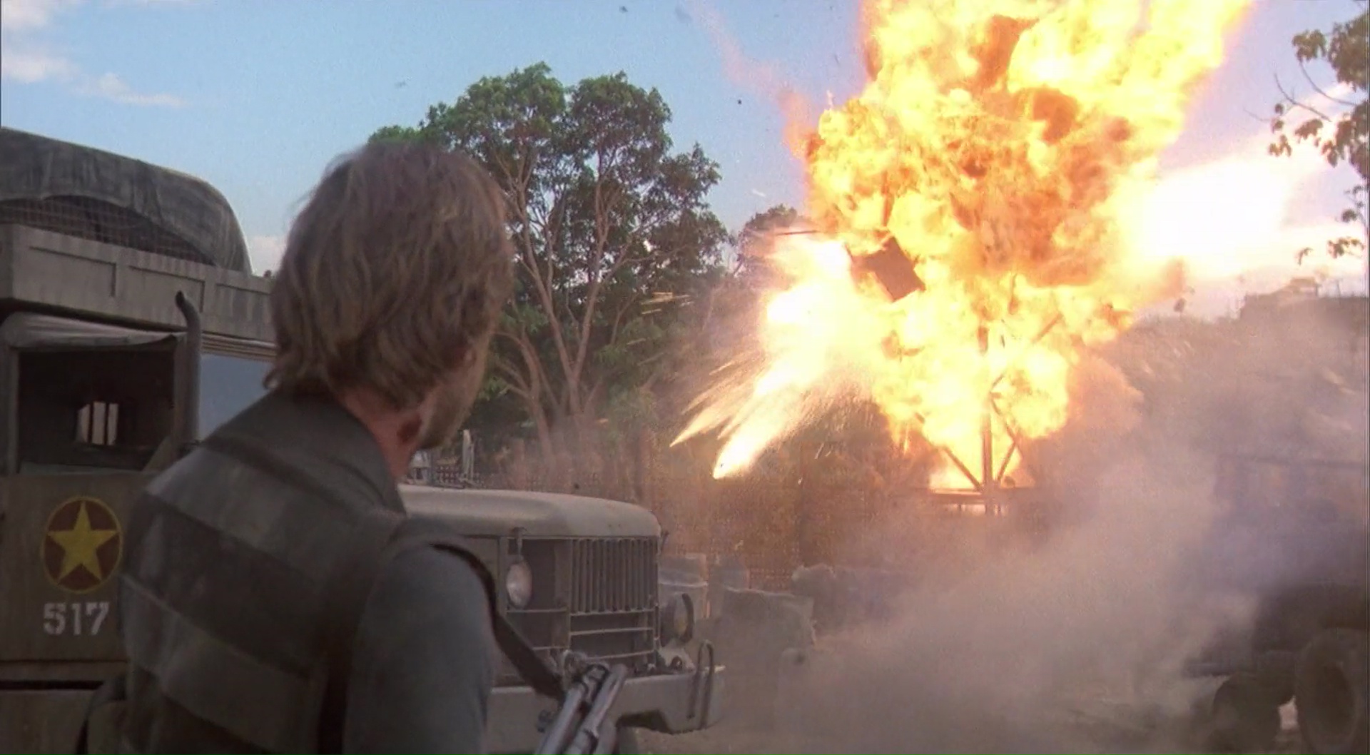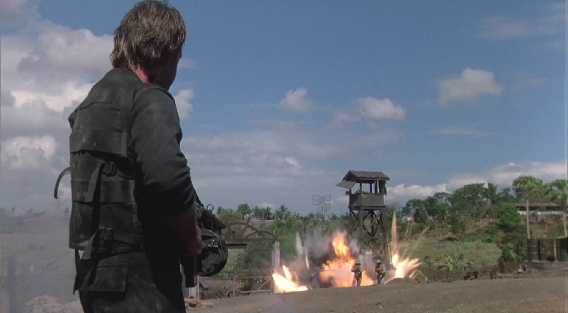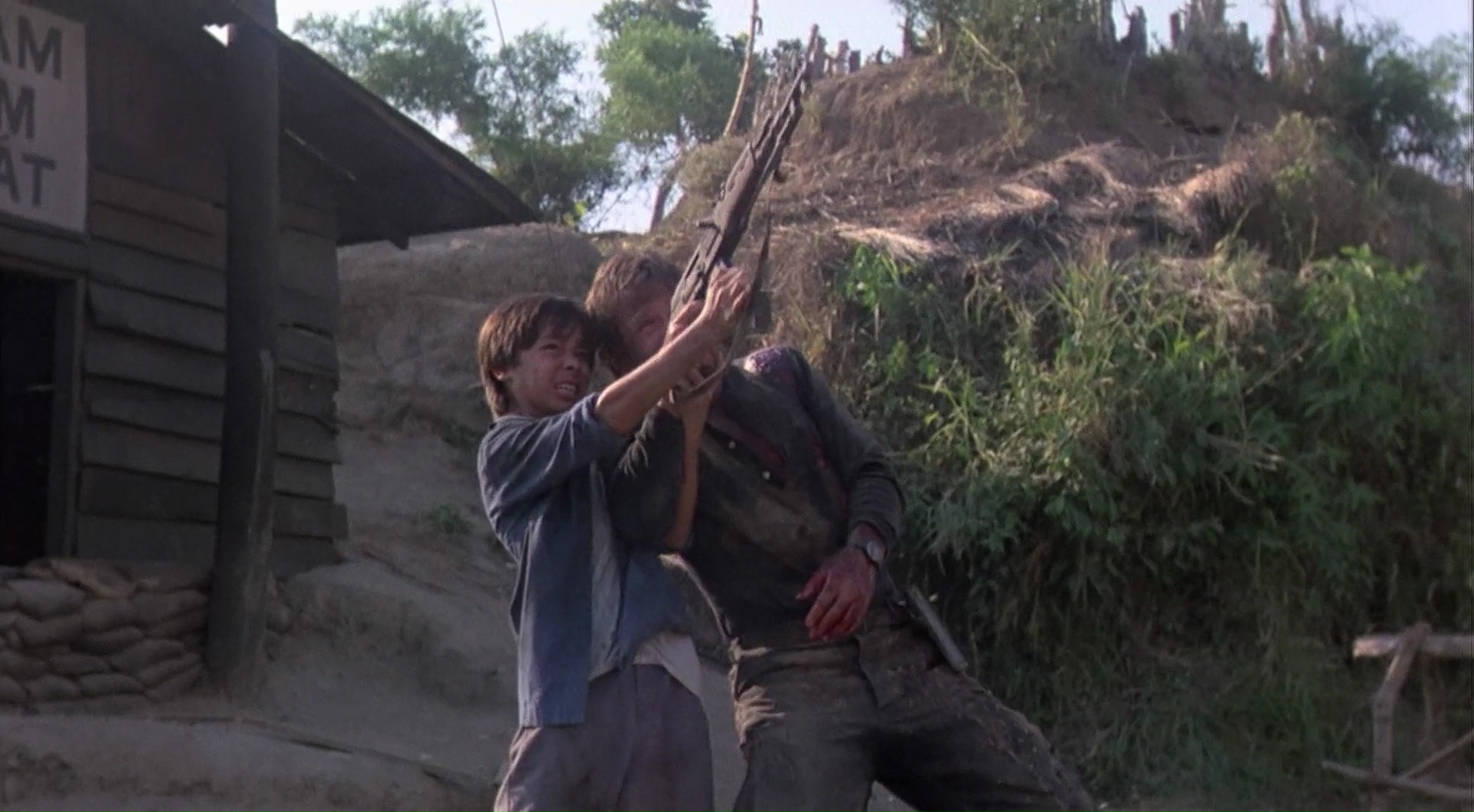 Tandis que les ennemis, eux, ratent le plus souvent la cible, même lorsque cela tiendrait du miracle. Pour preuve, cette course poursuite entre un camion et un hélicoptère, qui va tout de même rater le camion, même lorsque la voie est totalement dégagée, en étant assez près, et ce une bonne dizaine voir vingtaine de fois. Chapeau. À croire que Chuck est le seul à ne pas porter un gilet aimanté qui attire les balles. Ça, c’est beau. Mais après tout, Rambo aussi gagne la guerre quasiment seul, que ce soit dans Rambo 2 ou Rambo 3, durant les mêmes années. La différence (et malgré tout, je déteste Rambo 3), c’est bel et bien la qualité du métrage, Rambo ayant un budget confortable, une mise en scène soignée et un acteur qui y croit malgré tout, alors que Portés Disparus a un cachet de série B bourrine, et même de nanar pour ce troisième opus. Comme pour Rambo 3 ceci dit. Mais ce côté rend Portés Disparus 3 attachant, on ne peut pas s’y ennuyer, et on sent que tout le monde voulait faire un produit divertissant avant tout, malgré l’énorme maladresse du traitement en général comparé au sujet, bien plus grave. Et même parfois maladroit vis-à-vis de sa propre saga et cohérence, comme cette scène d’ouverture se déroulant en 1975, où Braddock assiste à la prétendue mort de sa femme, et qui est impossible si l’on en croit les événements des deux premiers films, Braddock étant à ce moment là capturé. Mais pas le temps de réfléchir, une fois lancé, rien n’arrête Braddock. À peine sur place, le voilà en pleine course poursuite avec la police. Et à peine s’évade-t-il de ses méchants Vietnamiens qui veulent toujours sa peau des années après qu’il va partir en guerre, seul, pendant trente minutes, faisant tout exploser, mitraillant à tour de bras. Un hélicoptère ne lui fait pas peur. Un village rempli d’ennemis non plus. Rien n’arrête Chuck Norris, rien ne lui fait peur ou ne le fait ressentir quelque chose ! Mais il était quand même temps que la saga s’arrête…