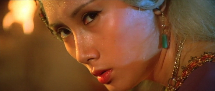 Portrait in Crystal est sans doute le film le plus fou de Hua Shan (Super Inframan, Soul of the Sword). Un an après le déjà bien barré Bloody Parrot, il va rajouter à son wu xia pian, déjà bien fantasy, de l’horreur, de la comédie, et même du pinku (avis aux amateurs). Le film va nous embarquer d’un incident à un autre : un héros emprisonné et rendu fou à l’intérieur d’une cloche géante, une jeune femme attachée nue à un crucifix pour des tortures sado-maso, une cage thoracique humaine suspendue comme une lyre pour provoquer des illusions psychédéliques, du poison qui fait gonfler et exploser des ventres, une combattante en cristal qui brille comme une boule à facettes, un esprit qui donne littéralement la lune, un combattant qui absorbe l’énergie du soleil pour faire enflammer son épée, des pièges à la Indiana Jones, des machines à fumée qui tournent à plein régime, des corps qui explosent, des masques Squeletor, du sang couleur vermillon, … Hua Shan se déchaine sur les effets pyrotechniques et psychédéliques transformant de nombreuses scènes en mini trip sous LSD. L’intrigue n’a pas beaucoup de sens au début, on se demande où elle veut nous amener, mais rapidement elle se transforme en un récit intéressant qui va regorger de concepts intelligents et même d’images relativement poétiques, le point culminant étant lorsqu’un des personnages féminins décroche vraiment la lune pour la tendre au héros.