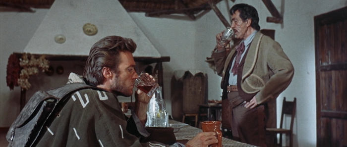La mise en scène de Sergio Leone est maitrisée de bout en bout, avec parfois un aspect baroque qui différencie immédiatement le film de ses homologues américains, jouant sans cesse avec la profondeur de champ ou à l’inverse avec des plans très serrés sur les visages. Nous sommes ici presque dans une pièce de théâtre (certains parlent d’opéra) à ciel ouvert, avec ces deux clans et leur grande bâtisse, qui se font face, avec un spectateur qui est mis au même niveau que le reste des habitants de ce petit village, cloitrés chez eux et épiant ce qu’il se passe cachés derrière les rideaux de leurs fenêtres. Le scénario est donc très léger, se basant sur une lutte entre deux clans et en plaçant son héros en plein milieu. Ce héros, c’est l’homme sans nom, l’étranger, l’Américain. Clint Eastwood incarne pour la première fois ce personnage un peu mystérieux, dont on ignore tout du passé, à commencer par son nom, affublé d’un poncho, fumant le cigarillo, presque mutique mais qui manie le pistolet comme personne. Ce personnage sera moult fois copié, l’exemple le plus connu étant Django qui va reprendre beaucoup de ses caractéristiques. Comme souvent dans le genre, les scènes s’étirent, aussi bien les plans d’expositions que certaines tueries, comme pour leur donner plus d’impact (visuel ou émotionnel). Leone s’amuse avec ses nombreux plans sur les regards, ses fameux plans sur les santiags avec des cadrages volontairement décadrés, ou encore son duel final qui prend son temps pour au total se régler en quelques secondes. L’ambiance y est souvent sombre, malgré quelques légères touches d’humour venant de certains personnages secondaires (le fabricant de cercueils). Pour une Poignée de Dollars verse dans le cynique, avec ses personnages tous gangrénés par l’appât du gain ou par des intérêts qui leurs sont propres. Même le héros, qui aura malgré tout le rôle du défenseur des habituels opprimés, a des intentions qui restent floues et tendancieuses. Le tout est accompagné par une bande originale assez exceptionnelle d’Ennio Morricone qui reste en tête très longtemps, capable de remplacer, à de nombreuses reprises, des lignes de dialogue pour faire passer les émotions ou les messages. Du grand art.
