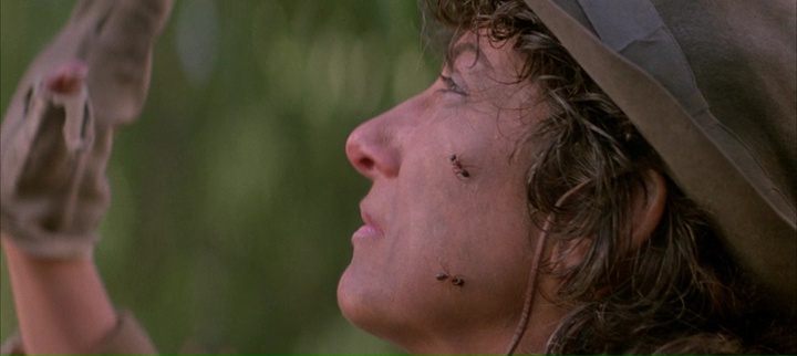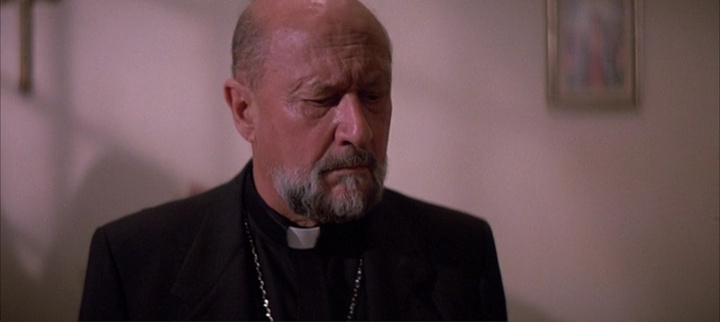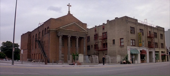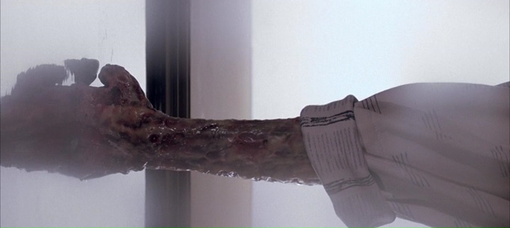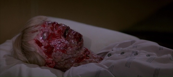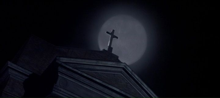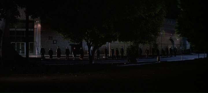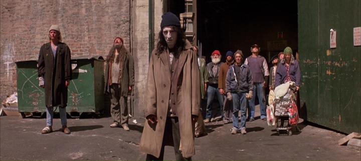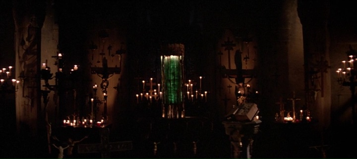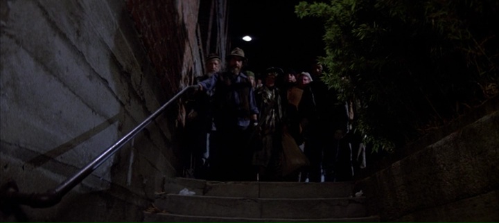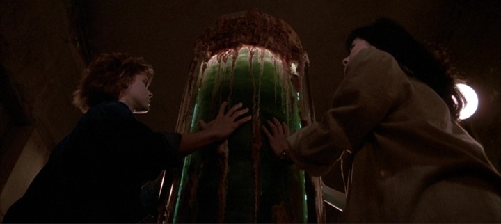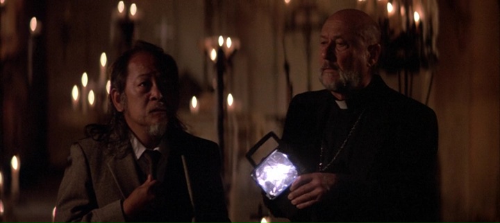 Bref oui, plus de 20 ans après la première vision, Prince des Ténèbres reste toujours pour moi le haut du panier dans la filmographie déjà bien haute de Carpenter. Et l’OST du film reste une de celles que j’ai le plus écouté. Ici donc, c’est l’histoire d’un groupe d’étudiants en science qui se rendent dans une église de Los Angeles pour étudier un mystérieux cylindre contenant un liquide vert pas très catholique, avec l’aide d’un prêtre, de quelques professeurs. Avec une longue introduction d’une demi-heure et un générique (entrecoupé par des scènes tout de même) de bien 9 minutes, Carpenter pose cash son ambiance et les ambitions du film. À savoir parler du mal à l’état pur mais d’un point de vu totalement scientifique et sérieux en tout instant. Le mal, ce serait le diable, mais d’un point de vue scientifique, expliqué à coup de quantique, de particules et d’anti particules, de reflets dans le miroir, de double. Et ça fonctionne du tonnerre pour peu que l’on accroche. Les décors de cette église à Downtown LA (Église que j’ai été voir lors de mon séjour à Los Angeles pour l’anecdote), les personnages, les mouvements de caméra, la musique, tout est tout simplement parfait d’un bout à l’autre, ou presque. Oui, on pourra dire que quelques moments sont un poil too much surtout que tout se prend vraiment au sérieux (l’anecdote du professeur Birack envers son élève, un poil trop surréaliste). Mais pourtant, rien qui ne retire à l’œuvre sa puissance. Car Prince des Ténèbres nous plonge constamment dans une ambiance tendue, étrange, entre les événements à l’intérieur de l’église mais également ceux à l’extérieur avec ces hordes de clochards qui restent immobiles des heures durant, à attendre, ou à guetter.
