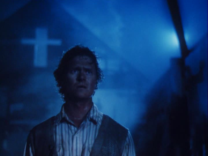Ed et le monstre seront ainsi reliés, Ed ressentira les atrocités que Pumpkinhead infligera aux jeunes, et au fur et à mesure des meurtres, Ed perdra son humanité alors que le démon changera de forme, se rapprochant plus d’un humain. De Ed en l’occurrence. Point de vue intéressant, mais qui ne sera pas suffisant pour élever le film au rang des excellentes série B de l’époque, tant la chasse que donne Pumpkinhead aux jeunes semble gentille, et surtout, peu mise en valeur. Le monstre lui, sera parfait à l’écran, mais son carnage sera décevant et banal. Le film se transforme en banal slasher lors de la mise à mort des jeunes. On pouvait attendre beaucoup d’un tel monstre, surtout mit en valeur de la sorte. Winston par contre se montre appliqué au niveau de la mise en scène pure, que ce soit pour les différents cadrages ou des éclairages, sublimes. La chasse aux jeunes de nuit se retrouve plongée dans des éclairages bleutés ou orangés du plus bel effet, donnant au démon un air effrayant. Le métrage s’avère tout de même décevant, quelque peu déséquilibré entre ses deux parties, ses personnages, et décevant par la chasse sanglante qu’il permettait (le second opus ira plus loin au niveau du gore, même s’il changera totalement la raison d’être du démon, et sera un ratage quasi total), et ne sera finalement qu’une œuvre banale de plus dans les années 80, dont on retiendra surtout le monstre et la mise en scène. Pas si mal dans le fond non?