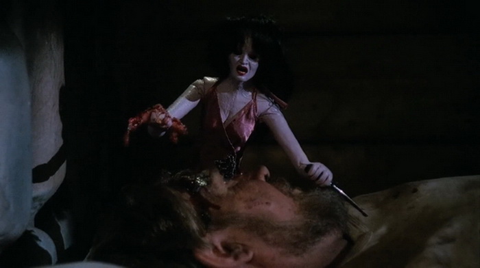 Puppet Master II va délaisser l’ambiance très étrange, parfois poétique, du premier film et va plutôt miser sur l’efficacité. Là où Puppet Master était vraiment très long à démarrer (il fallait prendre le temps de planter son univers), les meurtres interviennent ici beaucoup plus vite. Même si ce n’est pas encore tout à fait ça en termes de rythme, c’est déjà nettement mieux avec des marionnettes qui vont prendre nettement plus de place. Le travail de David Allen est une fois de plus à saluer. La stop motion est toujours super bien fichue et, quand on voit le très maigre budget du film, 780000$US, ça tient presque du miracle. Néanmoins, comme dans le premier, le gore se fait ici très discret. Même si les attaques sont parfois sadiques, cela reste visuellement toujours très gentillet. Même chose en ce qui concerne l’érotisme, on ne dénombrera qu’un seul plan boobs (signifiant la mort rapide du personnage), et un plan cul masculin. Oui oui, un mec à poil qui exhibe ses fesses. Serait-ce pour contenter le potentiel public féminin du film ? Ou est-ce l’œuvre de David DeCoteau, réalisateur homosexuel ici au poste de producteur, qui avait envie de faire plaisir à ses yeux ? Le mystère reste entier (même si j’ai ma petite idée). Le casting s’en sort plutôt bien de manière générale, mais leurs personnages ont parfois des réactions un peu crétines. Certes, c’est souvent le cas dans le cinéma horrifique, c’est d’ailleurs ce qui permet d‘amener les scènes de meurtres. Mais avouez que si vous tombiez sur cet être semi momifié, vous vous barreriez en courant non ? Ben eux non, pire encore, ils lui ouvrent le porte en lui disant « Bienvenue chez vous ».