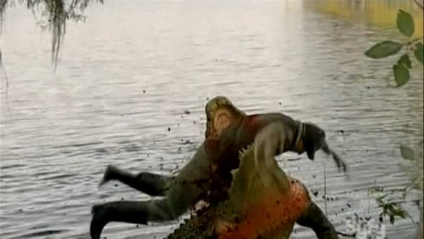 Par contre, s’il y a quelque chose qu’on ne peut pas reprocher au film, c’est d’être très généreux en termes d’attaques de nos reptiles. Le rythme est très élevé et on en a pour notre argent. Il faut dire que nos rednecks ne sont pas ce qu’il y a de plus fulgurant mentalement parlant et qu’ils aiment apparemment se frotter à la mort. Outre le fait qu’ils baignent dans tout ce qu’il y a de plus cliché, à savoir avoir une dégaine de plouc, manger salement, picoler comme des trous, ils sont souvent également complètement débile et n’hésite pas à se baigner dans des endroits reconnus pour être infestés de crocos.