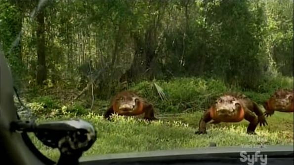 Du coup, nos amis les crocos vont s’en donner à cœur joie, avalant la fleur aux dents tout ce qui leur passe par la main sauf que budget riquiqui d’une prod Syfy oblige, les effets spéciaux vont justement être très spéciaux. Autant au niveau de l’animation des bestiaux, l’ensemble est assez réaliste, autant au niveau de la réalisation visuelle dans son ensemble, on est souvent dans le vite fait mal fait. Le numérique, quand on n’a pas beaucoup de moyens, ça passe ou ça casse… Là ça casse et c’est régulièrement assez hideux. Sur certains plans éloignés, il leur manque même la texture des écailles. Ca a au moins le mérite de nous faire sourire car on sent tout de même que le réalisateur a voulu réaliser quelque chose de fun et prend même plaisir à ajouter quelques petits effets gores assez sympathiques.