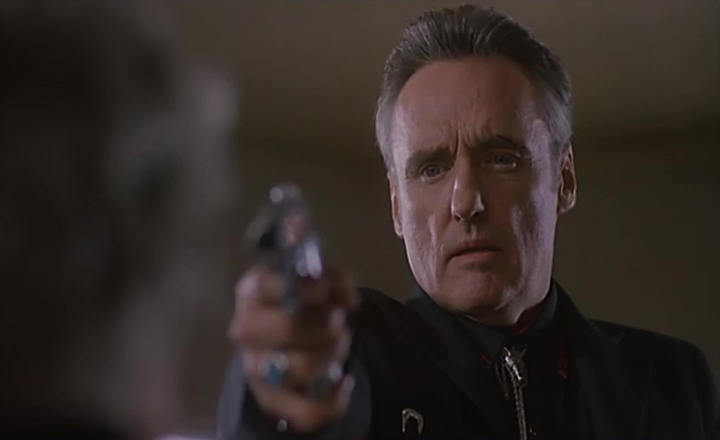Car oui, avec sa voiture venant du Texas, le propriétaire du bar (J.T. Walsh) où il s’arrête, Wayne, croit qu’il s’agît de Lyle, un tueur à gage qu’il a embauché pour tuer sa femme mais qui n’est jamais arrivé. Appât du gain oblige, Michael prend l’argent, et va immédiatement prévenir la femme qu’il doit tuer (Lara Flynn Boyle), qui l’embauche à son tour contre plus d’argent, pour tuer son mari. Malin, Michael prend l’argent et se met en route pour quitter cette ville où les habitants n’ont pas l’air très sains d’esprits. De là, c’est un tourbillon d’événements et surtout de malchance qui va s’abattre sur Michael. Pas mauvais dans le fond, il conduit à l’hôpital un homme qu’il renverse par accident. Sauf que celui-ci est en réalité blessé par balle, et l’hôpital appelle le shérif… qui par malchance s’avère être Wayne. En voulant s’échapper, Michael est prit en stop et peut enfin quitter Red Rock. Sauf que son gentil chauffeur n’est autre que Lyle (Dennis Hopper), le vrai tueur qui devait arriver plus tôt… Retour à Red Rock, la ville qui ne veut pas lâcher Nicolas Cage. Oui, tout ceci reste classique sur le papier (et ne représente que 30 minutes du métrage, je rassure, je ne spoile pas), mais diablement bien mené, filmé, monté et joué. Les acteurs nous font croire à leurs personnages, et chaque rebondissement nous fera dire « oh merde » face au manque de bol total de Nicolas Cage.