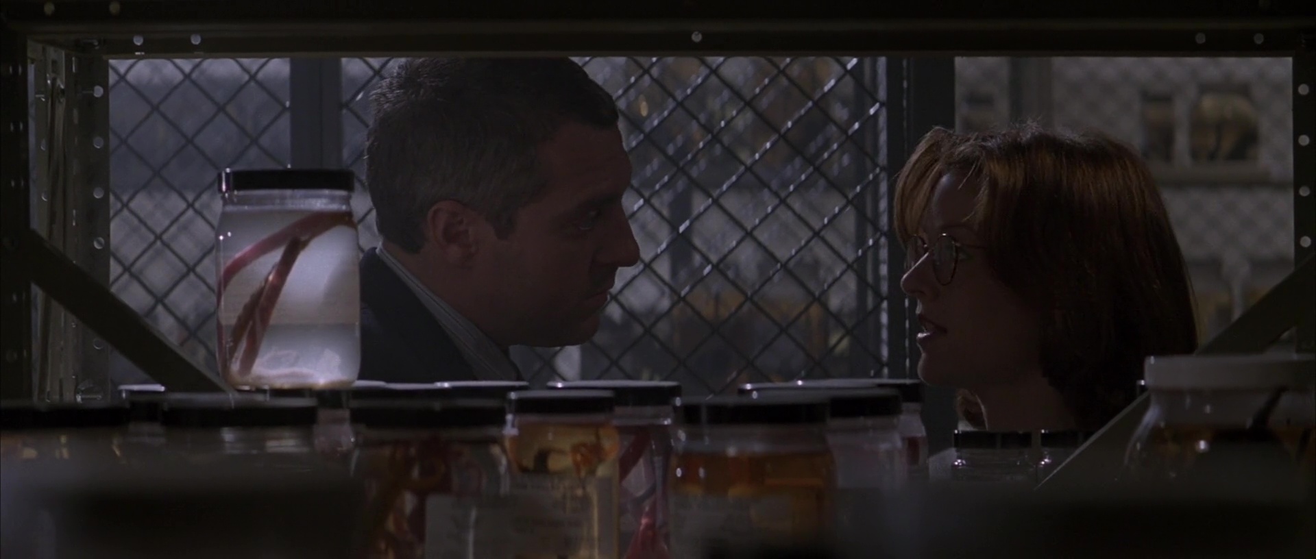 Durant la seconde heure donc, la créature par contre est bien plus présente, et enfin révélée à l’image. Et on peut le dire, Stan Winston a fait du plutôt bon boulot, et le choix de plonger souvent le film dans l’obscurité est payant, la créature était bien foutue et plutôt crédible. À l’exception de certains plans larges trahissant donc les CGI d’époque, et pouvant aujourd’hui piquer les yeux. Ces plans heureusement restent rares et Peter Hyams sait filmer sa bête. Mais soyons clair, Relic n’est au final qu’une série B de luxe bénéficiant d’un gros budget, qui ne raconte rien de nouveau et fait les choses certes proprement mais de manière ultra classique. Ne venez pas me demander pourquoi le film m’avait marqué plus jeune. Mais le spectacle proposé reste tout à fait sympathique encore aujourd’hui, possédant ces bons moments, son ambiance particulière, un très beau score musical de John Debney, et de bons acteurs bien que leurs rôles ne soient pas exceptionnels. Un pur produit divertissant que l’on pourra vite oublier, mais ayant au moins la chance d’être sérieux de bout en bout, pas comme d’autres excursions de gros budgets dans le genre horrifiques des années 90 (oui, je pense par exemple à Hantise…). Un bon petit moment.