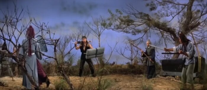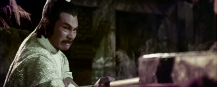 Rendezvous With Death est l’histoire d’un jeune et arrogant aventurier (Wong Yu) qui souhaite laisser son empreinte dans le monde du Jiang Hu. Dès le plan d’ouverture du film, Sun Chung nous le présente comme un être irrespectueux et fat, affalé sur une gigantesque statue de Bouddha comme si, Madame Récamier chinoise, il trônait sur un canapé… Loin de se sommeiller, il prend en fait la pose pour impressionner quatre redoutables bandits (dont Yuen Bun, Ng Hong Sang et Tommy Cheng Kei Ying) missionnés par un puissant seigneur. Son objectif, les assassiner pour reprendre à son compte la charge qui leur a été assignée afin de recevoir reconnaissance et fortune : convoyer un mystérieux paquet à travers le pays. Après une fort belle lutte réglée de main de maître par le talentueux et fidèle Tong Gaai/Tang Chia (toujours aussi fertile lorsqu’il s’agit de créer des armes originales), le jeune paon parvient à occire les brigands. Il se rend alors au campement du seigneur (Ku Feng) et, après l’avoir convaincu de sa virtuosité, se voit remettre le colis. Seule obligation : ne jamais regarder ce qui se trouve à l’intérieur…