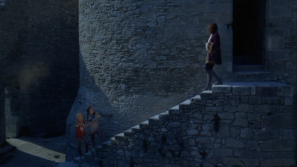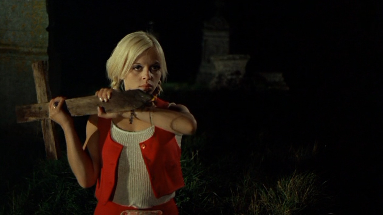 Ce qui choque dans un premier temps, c’est la manière dont Rollin insère dans son récit des idées en soit intéressantes, voir excellentes, avec une naïveté et un sens de la logique qui sont totalement absentes. Voir Marie-Pierre Castel draguer un vendeur dans un camion pour que son amie puisse récupérer de quoi manger, cela a du sens. Mais que les deux jeunes femmes se réfugient dans un cimetière, que l’une chute dans un trou, et que le gardien vienne reboucher le trou en déversant de la terre sur la jeune femme alors qu’il la voit clairement, cela n’a plus de sens. Et ces moments donnent un aspect totalement surréaliste au film, alors qu’il se veut souvent plus à terre que Le Frisson des Vampires par exemple réalisé la même année. Aucun doute, Rollin a construit son scénario autour d’idées purement visuelles et autour de ces lieux de tournage habituels, comme un gigantesque château gothique, un cimetière et autres. Et pourtant, il change la donne dés que ses personnages arrivent dans le fameux château, repère des vampires (on retrouve Dominique, qui jouait déjà la vampire dans le film précédent, apparaissant au bout d’une demi-heure ici). On y retrouve alors tout ce qui fait son cinéma.