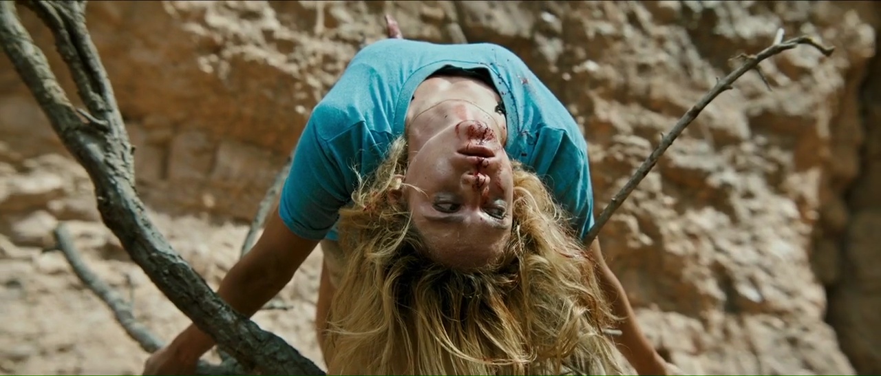 Tous les clichés du genre sont là, respectés à la lettre. Seulement on ne sait jamais vraiment le ton que Revenge veut emprunter et surtout veut faire sien. Car d’un côté, nous avons un ton général sérieux, des tonalités sentant bon les années 70, et de l’autre quelques scènes d’hallucinations et des scènes de violence qui insistent et durent, et en deviennent même grand guignol. Revenge aurait-il le cul entre deux chaises ? Très probablement. Est-ce dérangeant ? Et bien de mon point de vu, pas vraiment, sauf au moment que le film ne devait pas rater, à savoir la prétendue mort de l’héroïne, ce moment où doucement, on bascule dans la seconde partie, pour la voir s’en sortir et donc préparer sa revanche. C’est dans cette scène clé du métrage que le film a recours à son seul CGI bien voyant, mais là n’est pas le gros souci, le gros souci, c’est que vu la chute, la pauvre Jen aurait dû mourir. Oui je sais, c’est du cinéma, mais quand même, une telle chute, plus l’empalement sur un arbre en contrebas, cela retire pas mal de crédibilité au film. Pourtant on semble bien comprendre avec tout ce qu’il y a autour que Revenge n’est qu’une série B pas franchement sérieuse, mais cette scène m’a dérangé. C’est la seule d’ailleurs qui m’a dérangé. Que les personnages perdent par la suite 20 litres de sang, mais trouvent toujours le moyen de courir ne me dérange pas. Que les petites incohérences ou faux raccords soient là et assumés ne me dérangent pas du tout.