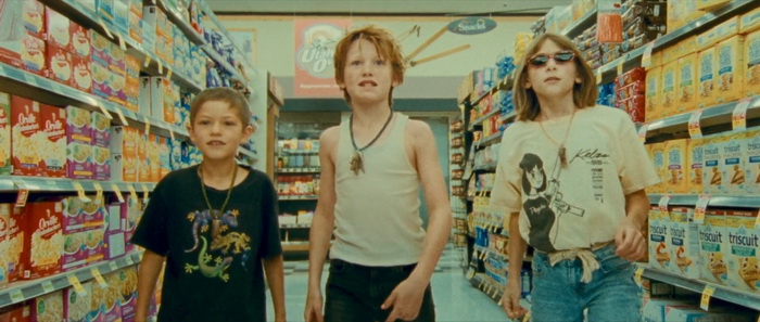 Weston Razooli est un cinéaste américain qui avant Riddle of Fire n’avait à son actif que quelques courts métrages ainsi que des clips musicaux, mais déjà se dessinait un univers singulier dans lequel se mixaient un style familier et quelque chose de jamais vu, un univers très ancré dans les années 70/80/90. Présenté à la Quinzaine des cinéastes au Festival de Cannes 2023, Riddle of Fire est donc son premier long métrage, un film à mi-chemin entre le conte et une partie de jeu de rôle, filmé à hauteur d’enfant, narré par une enfant, dans un univers enfantin mêlant magie et réalisme, mais surtout un film extrêmement ludique et mignon. L’introduction sous forme de poème énigmatique, récité par une petite fille, nous plante clairement le décor, nous serons ici dans une sorte de quête et les trois protagonistes nous sont présentés, de preux chevaliers en armure, casqués, sur leur fidèle destrier. En réalité trois enfants sur leurs petites motos, cagoule en guise de casque, des pistolets de paintball faisant office d’armes. Très vite, le parallèle avec le conte ou le jeu de rôle se fait, le film ne s’en cachant jamais et utilisant, voire détournant, tous les codes que l’on connait. Il y a d’abord le but ultime des enfants, jouer à cette nouvelle console, mais pour cela, ils auront une quête, ici donnée par la mère de deux des héros (chercher une tarte aux myrtilles), clouée au lit à cause d’une grippe. Cette quête sera au final une succession de plus petites quêtes (voler dans un centre commercial, récupérer un œuf, …), ponctuée de quêtes secondaires, un peu comme des niveaux dans un jeu vidéo, et de rencontres parfois mystérieuses. Tous les personnages sont des métaphores de personnages de conte ou de jeu de rôle, le titre du 3ème chapitre (Les 3 Gobelins, 2 fantômes, une fée, un troll, un chasseur et une sorcière) y fait d’ailleurs référence, et même les noms de certains de ses personnages (Anna Freya, Hazel, Petal), de gangs (Le Gang de la Lame Ensorcelée, Les 3 Reptiles Immortels) ou simplement de certains lieux font écho à certains contes ou certaines histoire d’heroic fantasy.