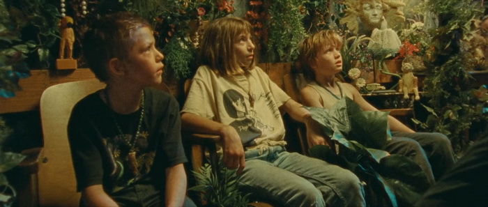 On nous parle de personnages qui ont des pouvoirs magiques, de disciples de ces personnages, de lieu fabuleux aux créatures uniques, mais il ne faut pas ici chercher de cohérence ni même à démêler le vrai du faux, car il faut prendre en compte que ce sont des enfants qui nous racontent cette histoire, avec des yeux d’enfants de 6 / 10 ans, et l’imaginaire des enfants se mêle à la réalité. Il faut revenir au même âge qu’eux et simplement se laisser porter. Mais Riddle of Fire n’est pas juste un film tout bête avec des enfants, Riddle of Fire est un film très réfléchi, très intelligent, et dans lequel rien n’est laissé au hasard. Ça fourmille de détails nous renvoyant aux contes / jeux de rôle, d’une mère allongée à l’étage qui pourrait faire écho à une reine malade en haut d’une tour, au simple design d’une maison, en passant par la musique qui accompagne parfaitement bien le film tout du long, à mi-chemin entre sonorités des années 80 et l’ambiance heroic fantasy avec des instruments comme la harpe ou la flûte. Visuellement, tout est également parfaitement calculé, avec par exemple un tournage en 16mm qui, couplé à des vêtements intemporels, donne un côté vieux à l’image, avec son grain épais typique, ses couleurs douces semblant parfois un peu délavées, au point qu’on demande réellement si le film n’a pas en fait 30 ou 40 ans. On notera également un très bon travail sur les couleurs, avec parfois une dominante de bleu qui représente souvent le bien, sur des détails comme des champignons extrêmement rouges parsemés ci et là dans cette forêt du Wyoming qui semble sans fin, mais également sur la luminosité, comme lorsqu’on découvre pour la première fois le groupe des méchants dans leur maison calfeutrée.