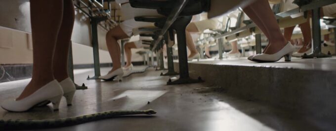 Bon bon bon, par où commencer ? Non car les productions animalières à destination du marché SVOD Chinois, on en a un peu fait le tour ces dernières années, avec l’araignée (Abyssal Spider), les rats (Rat Disaster), les serpents (Snake), les monstres moches et dégueulasses (Dragon Pond Monster), les requins (Escape from Shark’s Mouth) et mêmes les lézards (Nowhere to Hide). Mais pourtant, rien n’arrête ce marché, qui semble non plus vouloir concurrencer les Américains mais carrément vouloir le monopole du genre. Mais voilà, la SVOD Chinoise, c’est un peu comme les films Netflix ou Amazon. C’est au final tout juste sympa dans le meilleur des cas, et surtout, d’un film à l’autre, on a l’impression de voir les mêmes produits, tout se ressemble, un peu d’ailleurs comme si chaque plateforme avait son directeur de la photo attitré et qu’il dictait les règles pour éclairer tout le catalogue. Mais voilà, en 2022, ce Rising Boas in a Girl’s School m’a fait de l’œil. Déjà avec son titre légèrement débile qu’il serait très facile de détourner pour en faire un film classé X. Ensuite car de tous les films que je vous citais en début de texte, finalement, et bien ce fut les serpents qui s’en sortaient le mieux, alors pourquoi ne pas leur laisser une chance à ces innocentes petites créatures ? Au final, si ce n’est pas le film du siècle (duuuuuh), que l’on pourrait aisément caser le film dans la catégorie « métrage animalier numéro 137 du catalogue », et bien, encore une fois, les serpents s’en sortent bien et sont au-dessus des autres productions. Déjà car le métrage ne semble pas se prendre au sérieux, ce qui est toujours plus sympathique quand le propos et les CGI sont limités. Ensuite car en plaçant son intrigue dans une université formant des hôtesses de l’air, et bien, on a un magnifique quota de magnifiques Chinoises (hmm hmm).