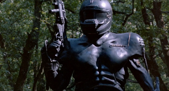 Comme ce sont tous des abrutis finis, le sketch des Inconnus sur le bon et le mauvais chasseur prend ici tout son sens : ils voient quelque chose bouger, ils tirent. Ou plutôt ils vident le chargeur de leur sulfateuse comme des gros débilos, ils canardent dans tous les sens sans jamais se poser de question. Mais heureusement, le robot Omega-1 (le Robowar du titre) est tout aussi con qu’eux. Ah le robot… le méchant robot… Quand je vous disais qu’on est dans un Predator du très très pauvre, il faut le voir pour le croire. Un pauvre mec en pantalon en cuir noir, avec un haut en cuir dur qui nous donne l’impression qu’il a de la poitrine, avec un casque de moto noir à peine customisé. C’est ça le robot high tech qu’on nous vend ? Non parce son équipement n’a rien de High Tech. Mais pire que son look, il y a sa vision que je qualifierais de cryptage Canal+ (les plus anciens comprendront). C’est monochrome, pixélisé à mort, on n’y voit rien, et lui aussi semble y voir comme à travers une pelle. Et pire que son look et sa vision réunis, il y a sa voix. Il parle avec une voix de crécelle trafiquée par ordinateur absolument ridicule avec une phrase qu’il semble répéter en boucle et dont on ne bite pas un broc. Si on tend bien l’oreille, on arrive à deviner quelques mots comme « Feu » ou « Humain », mais c’est bien peu. A quel moment ils se sont dit que ça serait classe ? A quel moment ils se sont dit que ça ferait badass ? A quel moment ont-ils sniffé trop de rails de coke ? En tout cas, l’amateur de nanar sera aux anges car ce méchant vaut son pesant de cacahuètes et les cadavres qu’il laisse, avec des corps gluants en décomposition, sont assez craspecs et visuellement réussis.