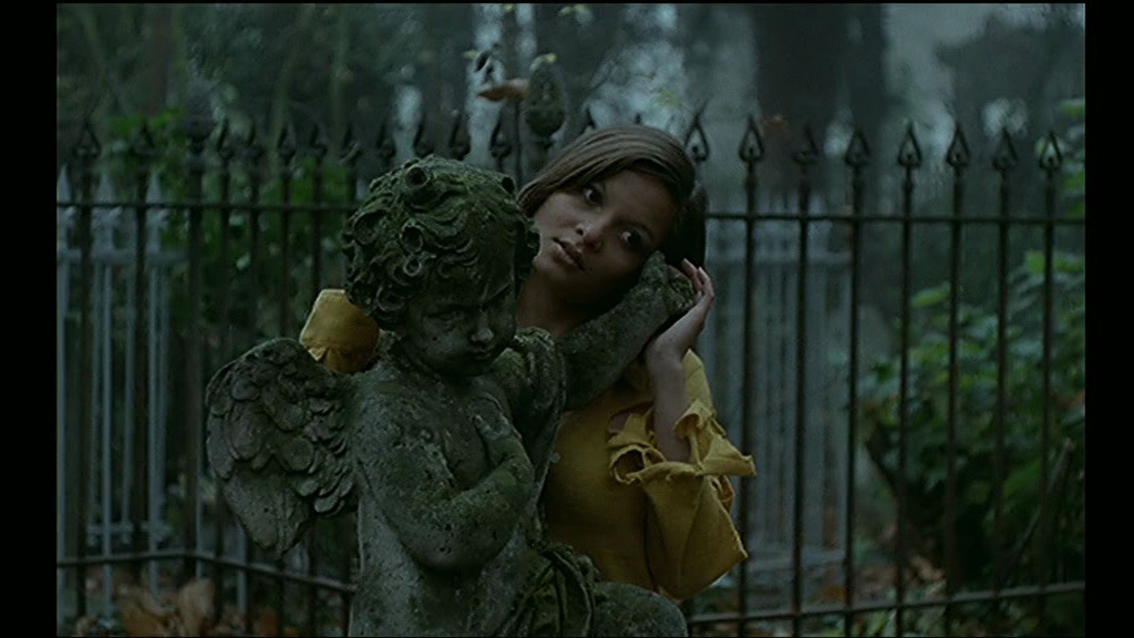 Avant même la tombée de la nuit, Jean Rollin filme son cimetière comme un personnage à part entière, et le peuple de quelques personnages, humains eux, mais forts étranges, à l’image de ce petit bossu (joué par Rollin lui-même), ou ce clown venant poser des fleurs sur une tombe ornée de chapeaux… de clowns. Si l’image du clown est souvent présente dans l’univers de Rollin (les deux personnages fuient dans Requiem pour un Vampire en étant maquillés en clowns, le clown est le gardien dans Les Démoniaques l’année suivante), il lui donne ici une signification poétique totalement surréaliste, et réussie. Si l’on pourra toujours pester contre certains dialogues prononcés de façon théâtrale et bien trop distante, à la tombée de la nuit, le film prend alors son envol. Jean Rollin soigne sa mise en scène comme jamais, livrant à chaque plan un véritable tableau, une peinture agréable à l’œil. Les déambulations de ces deux personnages principaux, en proie à la folie, si elle se fait extrêmement lente, ne semble pas longue. Car outre sa mise en scène travaillée, sa photographie magnifique, son décor très bien trouvé, Rollin a un autre atout dans sa poche. Deux autres même finalement. Le premier, ce sera l’actrice Françoise Pascal, totalement investie dans son rôle.