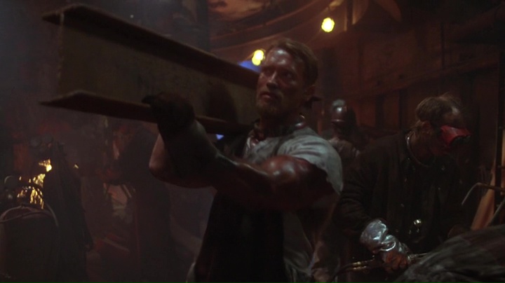 Heureusement le reste du temps, notamment lorsque nos personnages sont dans l’émission, le montage rend l’action plus dynamique et amusante, et les situations qui s’enchaînent aident le tout. Et il faut bien ça, plus les échanges totalement nawak entre Schwarzi et le présentateur télé pour remonter le niveau, car Running Man n’est pas franchement un très bon film. Oui, sa mise en scène comme déjà dit n’est pas exceptionnelle, la vision du futur au final assez limitée puisque la plupart du temps le film se déroule dans des décors en ruines. Alors oui, toutes les scènes se déroulant elles sur le plateau de télévision sont excellentes tant le personnage de Killian (le présentateur) est bien joué et hypocrite au possible (et second degré), mais au delà, c’est le Schwarzenegger show, mais sans le pouvoir destructeur sans limite d’un Commando. Un peu comme si le film, hors du plateau de télévision, voulait se prendre beaucoup trop au sérieux et ne s’assumait pas vraiment, ce qui est vraiment dommage. Reste un divertissement oui sans prise de tête il est vrai, plutôt rythmé, avec quelques excellentes scènes, mais qui n’a pas marqué les spectateurs à l’époque, et ne les marquera toujours pas aujourd’hui. Assez anecdotique donc.