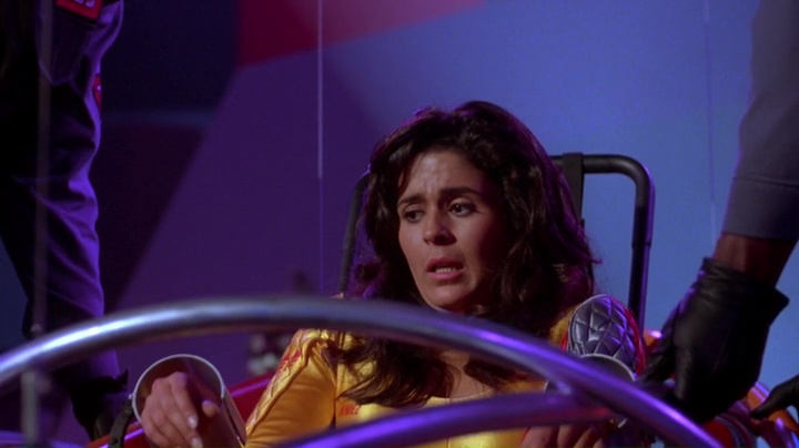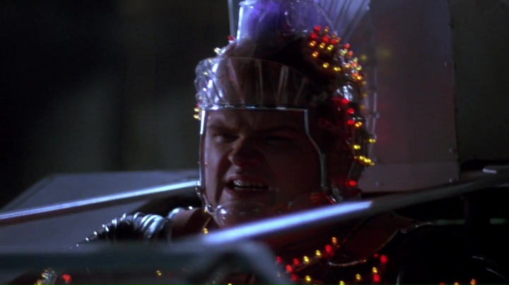 En direct, trois épreuves où lui et ses amis vont devoir survivre aux assauts de tueurs lancés à leur trousse pour faire plaisir au public et faire de l’audimat. Car oui le gouvernement est méchant, on peut tuer des criminels en direct à la télé, ça fait de l’audimat, et c’est toujours mieux d’avoir le public abrutit devant son poste de télé que dans la rue à faire n’importe quoi. L’idée n’est pas mauvaise, le film divertissant sur toute la ligne, mais il est vrai que dans sa mise en image, que ça parait kitch aujourd’hui. Entre les tenues des différents participants à l’émission, les émissions de télé qui sont hyper douées et passent des vidéos qui sont le montage de scènes déjà vues dans le film, et bien ça fait fort. Voir nos victimes potentiels en tenues moulantes et fluo, et bien, ça fait rire, le futur de la télé réalité n’est pas comme ça. Pareil pour les fameux traqueurs. Si certains ont de la gueule lorsqu’ils foncent vers leur cible tronçonneuse géant à la main, d’autres sont plus discutables, comme par exemple Dynamo et son costume aux couleurs qui clignotent et qui envoi des éclairs bien kitch. Forcément, le sérieux du film en prend un grand coup. Au niveau des défauts d’ailleurs, on pourra également souligner la mise en scène parfois assez plan plan de Paul Michael Glaser, qui notamment lors du final, ne donne pas de grande envergure ou de dynamisme à la scène. Issu du monde de la télé (les séries Miami Vice, Starsky & Hutch), il se contente de filmer simplement des échanges de tirs et puis… et puis voilà.