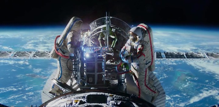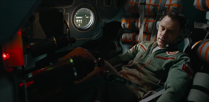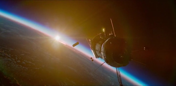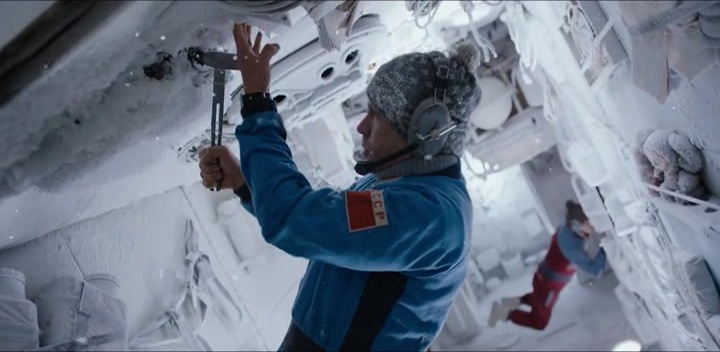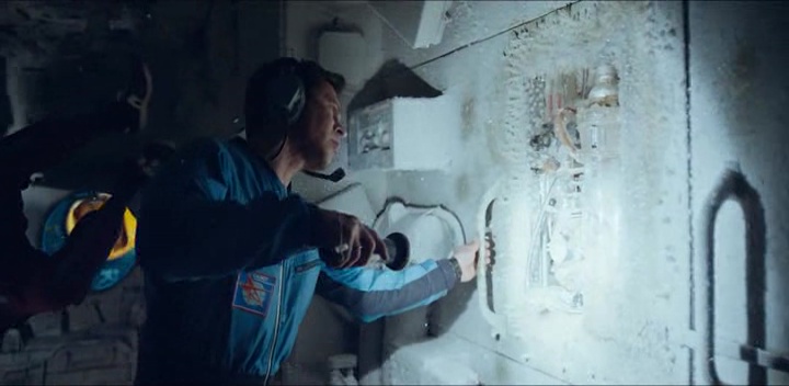 Alors bien sûr, je vais retrouver beaucoup à redire, surtout dans les moments dit héroïques, où la musique du film nous sort avec les violons pour bien faire ressortir l’émotion, et qui la plupart du temps paraît donc un brin too much. Ok, même totalement too much, notamment au début. Musicalement, le métrage en fait souvent des tonnes. Au delà de ce petit élément dont je voulais me débarrasser immédiatement, le film parvient à être à la fois réaliste et impressionnant, sans jamais en faire trop. Visuellement déjà, c’est splendide. Le film est impressionnant, les prises de vue en mettent plein les yeux, les effets spéciaux passent hyper bien. Parfois, on s’y croirait, et le réalisateur se fait clairement plaisir en multipliant les angles de vue possible. Parfois, on passe en vue subjective à l’intérieur du casque des cosmonautes, parfois, la caméra se fait plus libre (et là peut faire penser à Gravity, si l’on doit vraiment comparer). Visuellement le film n’a rien à envier aux blockbusters Américains. Encore moins quand on se renseigne et que l’on trouve le budget du film, apparemment de 400 000 000 Roubles, ce qui ne correspond en réalité malgré tous ces chiffres qu’à environ 6 millions de dollars ! Donc là, je dis chapeau, clairement. On est souvent ébahis par les images, sans pour autant que cela ne fasse du film une démo technique et sans jamais forcer le regard sur les effets spéciaux au détriment du reste. Car Salyut-7, c’est avant tout l’histoire de ces deux hommes qui vont parvenir à l’impossible, déjà en arrivant à rentrer dans la station tournant sur elle-même, et se retrouvant avec un nombre incroyable de soucis.