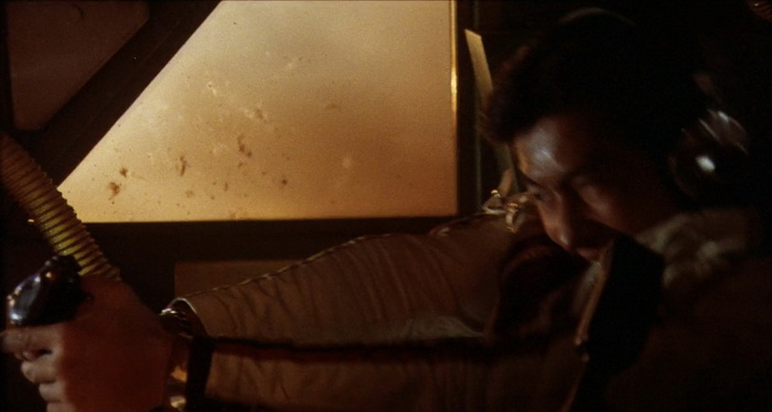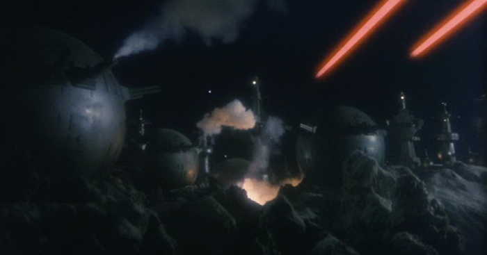Ce qui choque au premier abord dans Message from Space, c’est le manque total d’inventivité de la réalisation. Fukasaku qui est connu pour la nervosité de sa mise en scène, pond ici un produit morne, et lent. Même les scènes de combats sont plates et paraissent sans vie. Les effets spéciaux, de leur côté, sont par contre tout à fait convenables pour l’époque. On est bien sur assez loin de la réussite que constituait une année plus tôt le film de Lucas, mais le tout reste crédible, malgré les quelques mauvaises incrustations de maquettes, et le côté trop jouet plastique des vaisseaux. Des vaisseaux, surtout ceux des deux héros, qui sont nettement influencés par ceux de Star Wars, comme une grosse partie des armes, et décors. On y retrouve donc pêle-mêle des héros vaillants pilotes, un robot intelligent, des fusils blaster, une planète qui est en fait une base inexpugnable (qu’on doit détruire en faisant sauter son générateur, caché dans les profondeurs de la structure, par un tir de missile, après avoir piloté dans un tunnel étroit poursuivi par des vaisseaux ennemis. Ça ne vous rappelle pas la fin de quelque chose ?), mais aussi un fouet laser (c’est mieux que le sabre), etc… On ne peut cependant pas reprocher à Message from Space sa filiation trop prononcée avec Star Wars, ou bien il faudrait aussi répudier les centaines de copies plus ou moins bonnes réalisées dans les années qui suivent.