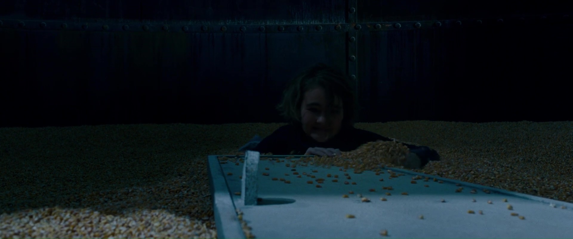 D’emblée, j’aime, jusqu’à la fin de cette introduction, osée et me faisant dire qu’on tient bien là un bon grand film. Passé cette introduction, le film reprend lors du jour 472, soit 472 jours après le début de la catastrophe, et le film va se focaliser donc sur nos personnages, à savoir les parents (Emily Blunt et John Krasinski, d’ailleurs coscénariste et réalisateur du film) et leurs deux enfants (Millicent Simmonds et Noah Jupe), confortablement installés dans un coin reculé. Avec la petite introduction en poche, le réalisateur n’a pas besoin de développer plus, il a déjà toutes les cartes en mains pour faire fonctionner son film. Des monstres errent, le moindre bruit les attire, et donc notre famille vit dans un coin reculé où ils se mettent à surveiller le moindre de leurs sons. Et cet effet de stress constant, de surveillance constante, et bien elle marche du tonnerre, même si on pourra rapidement pester contre un point du scénario, qui paradoxalement, nous réservera de très bons moments que l’on voit venir à l’avance, avec notre héroïne enceinte. Car oui, accoucher, ce n’est pas sans douleur, ça fait du bruit, et un bébé, n’en parlons même pas. L’idée est bonne, même si on se dit que l’idée même d’avoir un bébé est totalement inconsciente, mais bon, durant les 1h30 du métrage, on adhère à ce choix. Et A Quiet Place fait alors presque un sans faute, disons même qu’il frôle le sans faute durant 1h20. Le silence dans lequel nous plonge le métrage devient très rapidement ultra pesant. Rien que de voir la famille devoir préparer un repas dans le silence le plus complet, et paniquer dés qu’un petit élément tombe par terre provoque son petit effet. Même la petite routine, avec les repas en silence, le sable qu’ils mettent par terre autour de la demeure pour limiter le bruit provoque un certain petit malaise. Il n’y a que les rares sorties extérieures qui viennent briser le silence installé autant par le concept que par la mise en scène, comme lors du passage de la rivière.
