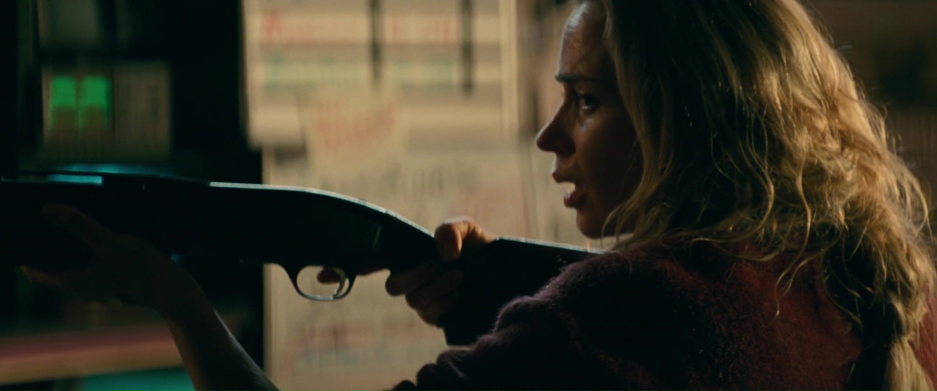 Sans un Bruit, alias A Quiet Place, avait apparemment fait pas mal de bruit (ah ah) dés l’apparition de son premier trailer. Que je n’avais bien évidemment pas vu puisque je ne regarde jamais de trailers, de peur d’être spoilé, ou que l’on me vende un film qui n’a rien à voir au final avec le produit terminé. Mais ça ne m’a pas empêché d’être attiré pour le voir, car il faut dire qu’entre 3 films de genre blindés de jumpscares putassiers, A Quiet Place semblait avoir de bonnes choses pour lui. On pourrait même dire que le métrage fait parti d’une petite vague de films de genre récents qui se décident à exploiter les différents aspects cinématographiques pour offrir une bien belle ambiance. Je veux parler de ces films, qui utilisent le plus souvent une mise en scène simple, mais surtout fluide et appliquée, et utilisant le son pour poser une ambiance, et parfois même raconter quelque chose. En gros, se servir du média utilisé de manière intelligente. Par là, je parle bien entendu de Don’t Breathe et son utilisation parfois du noir (le personnage étant aveugle) et du son (il perçoit mieux les sons), Green Room (dans un univers musical), Hush – Pas un Bruit (avec son personnage principal sourde et muette), et maintenant ce A Quiet Place. Le métrage nous place directement pas mal de jours après le début d’un drame quelconque qui aurait dévasté en partie l’humanité. Dans sa mise en place, on pense limite à tous ces films de zombies actuels. Une ville dévastée, quelques survivants enfermés dans un supermarché et qui ne doivent pas faire de bruits pour ne pas attirer quelqu’un ou quelque chose. Comme je ne savais même pas de quoi le film parlait, ça fonctionnait super sur moi d’ailleurs. L’introduction prend son temps, les plans sont élégants et travaillés, le silence rapidement pesant (le film n’est pas un film bien bruyant). On a tout de même droit à une intro de 10 minutes, sans jumpscares, sans shaky cam, sans longs dialogues inutiles prenant le spectateur par la main.