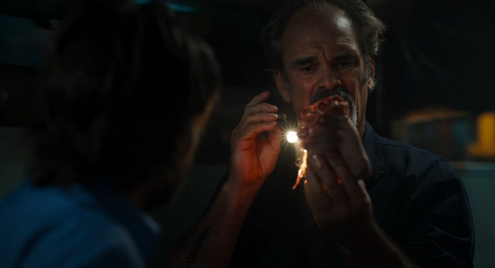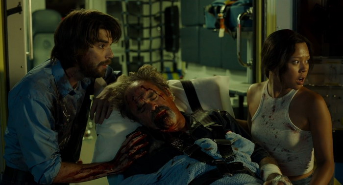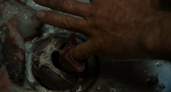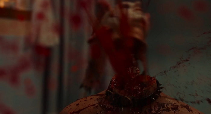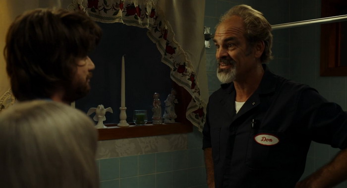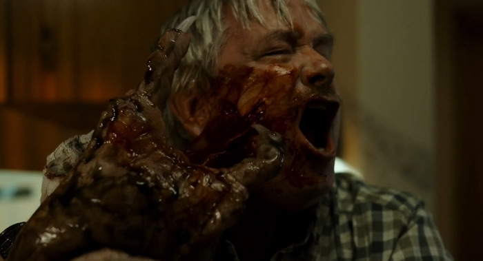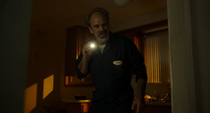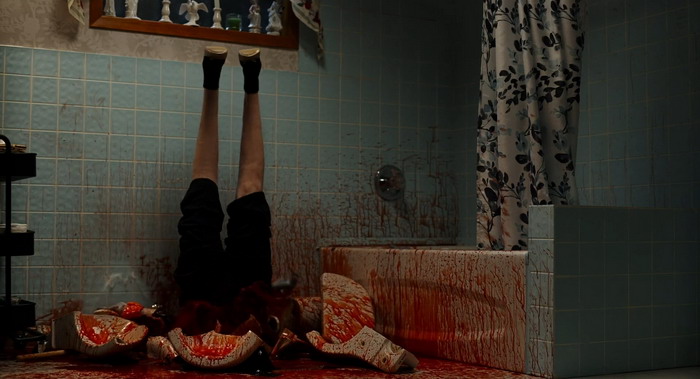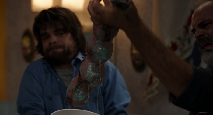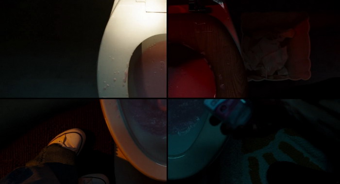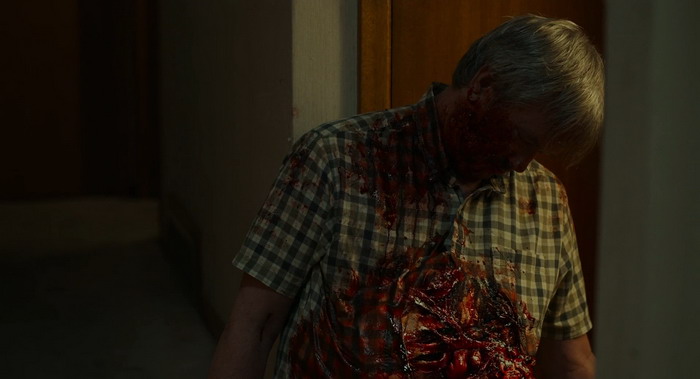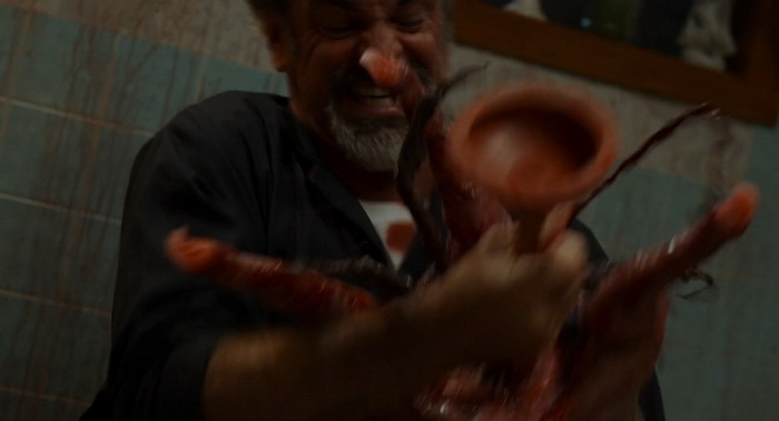 Scared Shitless va rapidement nous faire comprendre que nous sommes ici dans une comédie horrifique décomplexée qui va osciller entre gore et absurdité. On va suivre Don, un plombier un peu désabusé, qui va embarquer son fils germaphobe (depuis la mort de sa mère) lors d’un dépannage dans un immeuble pour le confronter à sa phobie. Mais ce quotidien banal va être bouleversé lorsqu’un monstre génétiquement modifié se cache dans les conduits de l’immeuble, terrorisant les habitants en sortant par leurs toilettes. Oui, rien que le pitch est absurde. Avec son 1h15 au compteur, génériques compris, Scared Shitless ne perd pas de temps et annonce la couleur dès sa scène d’introduction. A partir de là, le film va nous laisser que peu de temps de répit avec un enchainement de péripéties et/ou de moments d’exposition souvent absurde où les gags et les répliques funs vont côtoyer le gore, provoquant des fous rires aux gens qui seront réceptifs à ce genre de divertissement. Vivieno Caldinelli arrive parfaitement à doser son mélange de comédie et d’horreur, tout en développant en arrière-plan une relation père-fils avec des problèmes de communication et permettant très rapidement de nous attacher à ces deux personnages tantôt loufoques, tantôt très humains. Entre conflits familiaux, exaspération mutuelle et moments de complicité, le réalisateur arriver à développer une vraie dynamique narrative avec en plus un duo d’acteur, composé de Steven Ogg (Trevor dans GTA V) et Daniel Doheny (The Order) qui apportent une vraie profondeur à leurs personnages que le scénario n’a pourtant, avec sa courte durée, pas forcément le temps de bien développer. Avec l’arrivée de la jolie Chelsea Clark (la série Ginny & Georgia sur Netflix), de nouvelles dynamiques se créent et amènent un nouveau souffle à mi-film. Dans cette deuxième partie, l’humour s’efface un peu, bien que toujours présent, pour laisser place à un léger suspense jusqu’à l’affrontement final contre le monstre, malheureusement un peu trop vite expédié, possiblement à cause du faible budget du film.