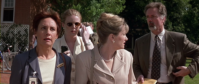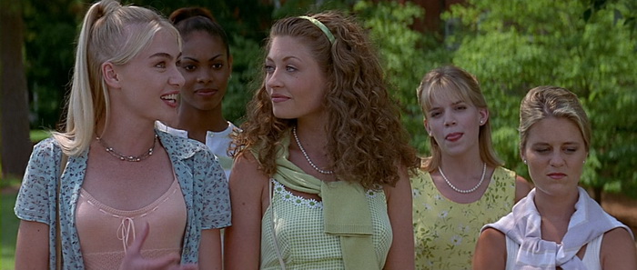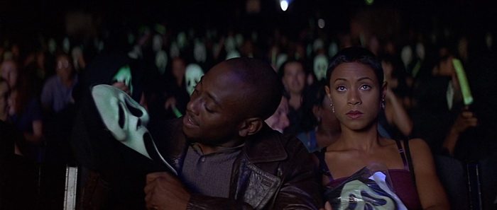 Car oui, j’ai passé un très bon moment devant Scream 2. Etant déjà une fervente inconditionnelle du premier volet, je constituais certes un terrain fertile pour qu’une suite me plaise, mais j’avais également de grosses attentes. Comme toute la génération des années 90, je suis née avec les films d’horreur, et surtout les slashers. J’ai grandi avec Freddy, Michael Meyers, Jason Voorhees et surtout Ghostface. Tout autant d’œuvres qui ont su définir et respecter les codes propres au genre. Respecter ? Si on y réfléchit, dès le premier opus, Ghostface venait déjà chambouler tout le canevas démocratisé par Carpenter. La dimension structuraliste de Meyers, que l’on pouvait, en somme, retrouver chez Jason ou Freddy, prend une toute autre tournure pour Scream. Nous ne sommes plus seulement poursuivis par une entité maléfique, conceptuelle, assez peu défini, non… Elle a un visage, elle a une raison et SURTOUT elle est proche de nous. De slasher nous passions à Whodunit (1), un subtil mélange d’horreur et de policier qui nous faisait rester à l’affut de chaque regard, chaque émotion de chaque personnage dans le cercle d’amis intimiste qui constituait Scream. Et c’est justement ce mélange là que Scream 2 a du mal à gérer. J’avais encore en mémoire cette fin catastrophique. Une surenchère gratuite, hystérique, qui selon moi ne tenait pas la route, et qui de mémoire avait ridiculisé tout le film. Je suis toujours restée sur cette impression, alors que j’étais en réalité, passé à côté. Passons tout d’abord en revue ce que je reprochais à cette suite.