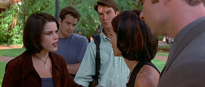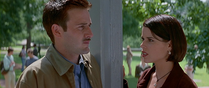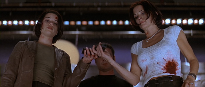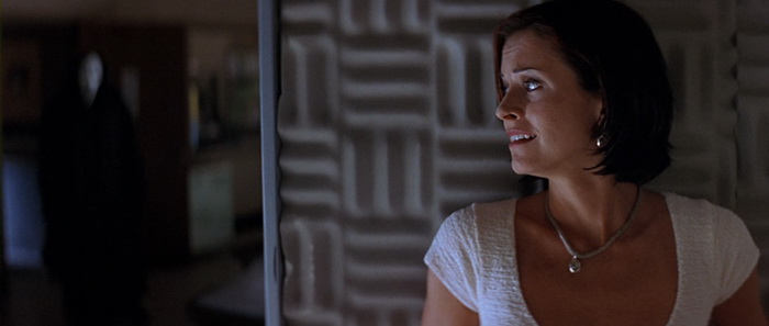 Egalement, comme la séquence inaugurale de Scream, qui jouait sur la popularité de Drew Barymore, c’est cette fois ci Sarah Michelle Gellar, en pleine ascension avec Buffy contre les Vampires, qui vient rejoindre le casting pour une des scènes chocs du film. Elle apparaissait déjà comme une étudiante intéressée et intéressante. Loin du cliché de la blonde écervelée, le personnage de Casey reflète une étudiante en cinéma qui assume sa féminité tout en faisant preuve de solides références (rappelons qu’avait de mourir, elle regarde Nosferatu – référence à Buffy ?). A l’image de son héroïne forte dans la série, Casey se bat contre une relation toxique, se cultive et s’occupe de ses « sœurs ». Elle est responsable, curieuse et drôle. Sa mort n’en est que plus magistrale. Et ce n’est pas le seul moment où Craven met en exergue une idée féministe. Dans le troisième opus, Sydney nous est, tout le long, présentés comme une victime, qui vit recluse chez elle. Cette expérience sera révélatrice de sa force. Elle doit se réapproprier une vie volée. On pourrait aisément faire le parallèle avec des victimes de violence, qui peine, par culpabilité et par souffrance, peine à être de nouveau maître de leur vie, de leur corps. Le second opus est un long et douloureux chemin vers la lumière qui place l’héroïne non plus en tant que personnage passif, qui voit se dérouler les évènements et dont la seule réelle action est d’être la dernière survivante, mais bien comme actrice de son propre destin. Mais tout cela, nous y reviendrons dans un prochain article, sur la fin de la trilogie…
