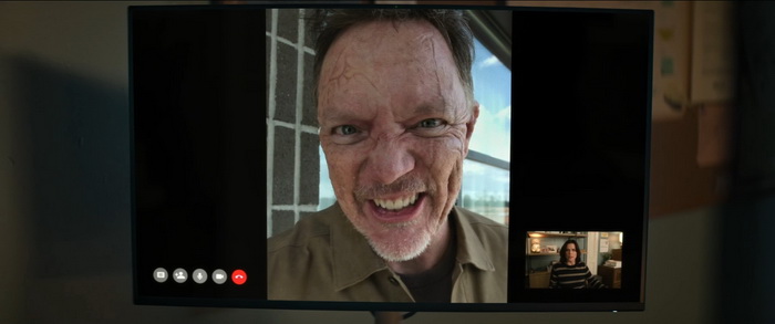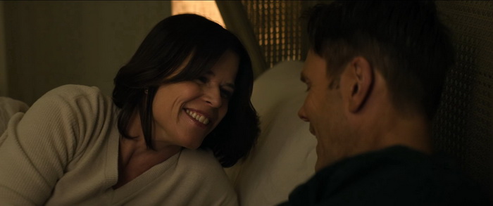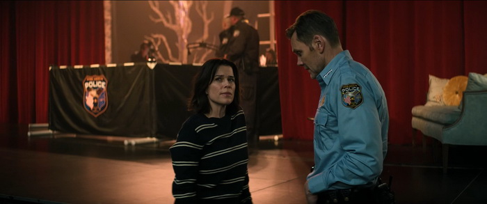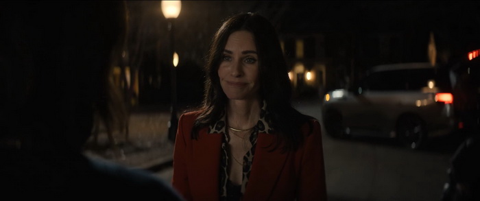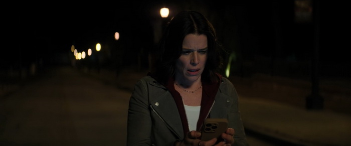 Par où commencer tellement il n’y a rien qui va avec ce Scream 7… Scream 7 sort 30 ans après le premier opus et semble être un hommage au premier opus de la saga initiée par Wes Craven. Pour l’occasion, C’est donc le retour de Kevin Williamson qui, en plus de s’occuper du scénario, est également à la mise en scène. Et la première chose qu’on peut dire, c’est que sa mise en scène est plate, un peu à l’image de sa seule autre réalisation, Mrs Tingle (1999), complètement passe-partout et à aucun moment il n’arrive à insuffler à son film une quelconque intensité. Le suspense est inexistant, il n’y a aucune folie créatrice, et une fois de plus ce Scream 7 se content de recycler à outrance ce qui a déjà été fait. Le scénario de Guy Busick et James Vanderbilt, aidé par Williamson lui-même donc, est inconsistant et c’est l’encéphalogramme plat en terme d’émotions que le film procure du début à la fin. Mais ça à la limite, c’est peut-être le moins problématique, c’est dire si c’est calamiteux. Déjà, le casting est réellement problématique. Déjà que les personnages sont écrits avec les pieds et qu’on leur fait réciter des dialogues souvent insupportables, les acteurs ne mettent aucune intensité, aucune passion, à commencer par Neve Campbell qui ne voulait pas revenir au départ, mais qui a finalement accepté lorsque le montant de son cachet s’est élevé à 7M$US. Oui, il fallait bien compenser l’absence de Jenna Ortega qui a décidé qu’elle ne serait pas de la partie (sentant peut-être le naufrage). Elle a accepté, certes, mais on sent qu’elle n’a clairement pas envie d’être là, se contentant souvent d’errer à l’écran, le regard vide, en récitant des lignes de textes auxquelles elle ne semble même pas croire. Il en est de même avec Courteney Cox, toujours fidèle au poste, mais dont l’utilité au récit est proche du néant. Sans parler du caméo de David Arquette, dont le personnage est décédé dans un opus précédent, qui n’est là que pour flatter les amateurs des films originaux. Mais le plus cynique, le plus ridicule, c’est le retour de Matthew Lillard, qui interprétait un des deux tueurs dans l’opus original, via l’entourloupe la plus pété et prévisible qu’il était possible de faire. Oui, l’IA est sur toutes les bouches en ce moment, et elle est aussi dans le scénario de Scream 7 parce que c’est hype.