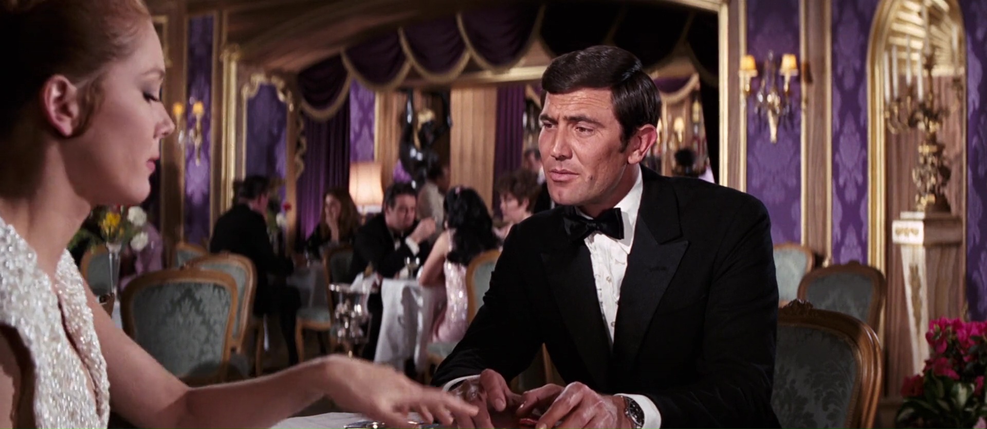 Sean Connery décide de ne pas revenir dans le prochain James Bond, le sixième opus. Qu’à cela ne tienne, les producteurs se retrouvent dans une position difficile mais ne vont pas se laisser abattre. Le budget reste à 7 millions, John Barry reste à la musique, Richard Maibaum reste encore et toujours au scénario, tandis qu’il est décidé d’adapter le roman Au Service Secret de sa Majesté. C’est finalement au culot que George Lazenby, un parfait inconnu même pas acteur, récupère le rôle titre de James Bond. Tandis que l’équipe pensait au départ embaucher Timothy Dalton, qui refuse, se trouvant trop jeune pour le rôle. Les producteurs pensent un moment expliquer le changement d’acteur, avant de laisser tomber l’idée, si ce n’est une petite blague brisant la quatrième mur au début du film. D’ailleurs, la technique évolue dans ce film comparé aux cinq premiers opus : le film utilise parfois du ralentis, l’usage du flashback. Choix étonnant, le thème d’ouverture sera instrumental, une première depuis Bons Baisers de Russie. Diana Rigg, alors bien connue pour Chapeau Melon et Bottes de Cuir, récupère le rôle de la James Bond Girl principale. Et le métrage s’avère dans son ensemble être une excellente surprise. Non pas qu’il soit parfait, ou que George Lazenby fasse totalement oublier Sean Connery, mais il nous raconte probablement l’histoire la plus humaine de la saga avec un James Bond qui va réellement tomber amoureux. Voilà qui le change de l’éternel dragueur misogyne que l’on connaît. George Lazenby, sans faire oublier Connery, campe un Bond plutôt honnête, voir bon, et quand on sait que de base, il n’était pas acteur, c’est encore plus impressionnant. Certes par moment son jeu semble vouloir un peu copier ce qui a été fait avant lui, mais ça passe clairement.