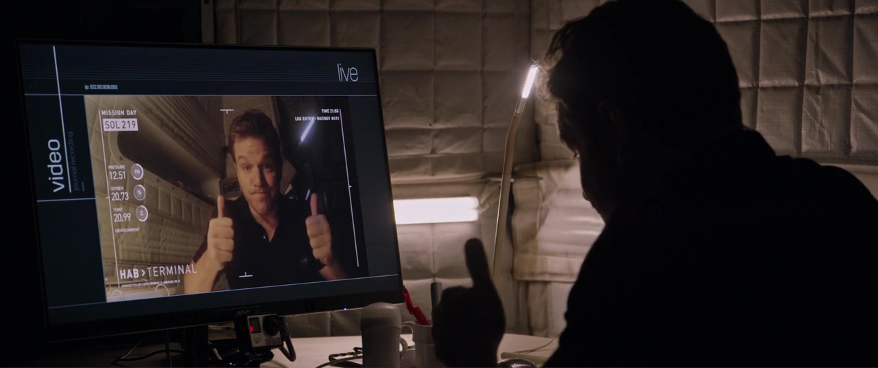 Il est ainsi bourré d’humour, que ce soit dans les dialogues, les réactions des personnages, ou même certaines scènes qui semblent abracadabrantesques dans la façon dont elles sont abordées. Les réactions de Matt Damon valent parfois de l’or. Et c’est bien lui, son personnage en tout cas, qui en plus d’être au cœur du récit, est le principal intérêt de Seul sur Mars. Avoir un scientifique calé dans tous les domaines et qui perdrait donc les spectateurs n’aurait aucun intérêt, et avoir un nul rendrait le film peu crédible dés le départ. Seul sur Mars tranche donc entre les deux, Mark Watney prend chaque situation avec beaucoup d’humour, et n’hésite pas à expliquer en souvenir les événements via un journal vidéo, qui est donc en quelque sorte adressé directement à nous, spectateurs. Et ça fonctionne de la première à la dernière minute, alors que le métrage dure tout de même 2h30. Ridley Scott a d’ailleurs du bien comprendre que Mark était l’atout du film, puisque sa mise en scène reste extrêmement sobre, n’en fait jamais trop et s’intéresse donc avant tout à la psychè de son personnage. Les vrais rebondissements seront d’ailleurs peu nombreux, au nombre de deux ou trois en tout, en comptant la situation initiale. Le reste est toujours abordé d’un ton léger, même lorsque la caméra de Scott s’éloigne de Mars pour suivre les aventures de la NASA sur Terre dans ses tentatives de communiquer avec Mark, et de le ramener ici. On retrouve d’ailleurs alors avec plaisir Jeff Daniels, bien plus convaincant que dans Divergente 3, et Sean Bean qui ne mourra pas pour une fois.