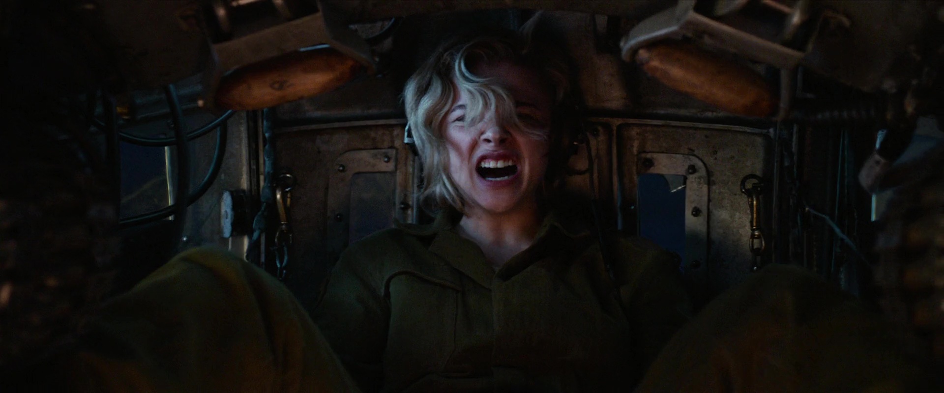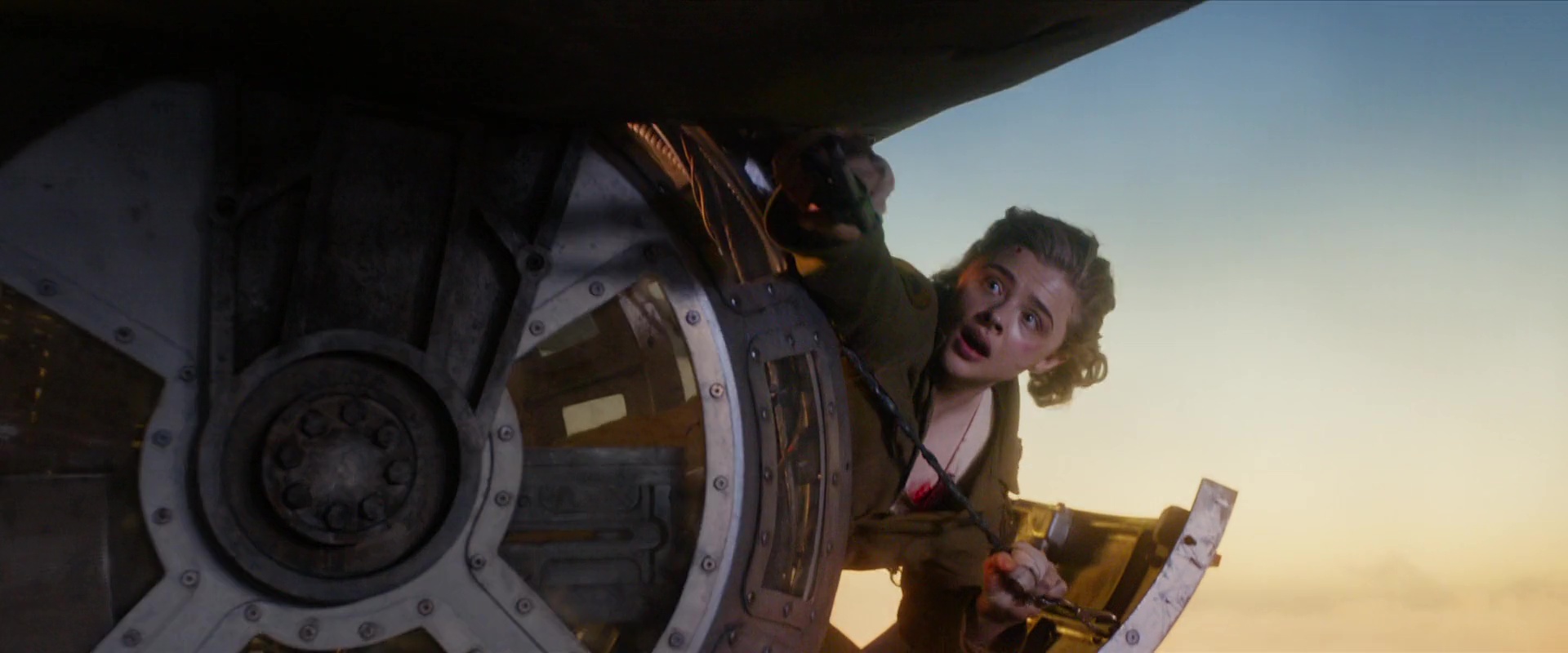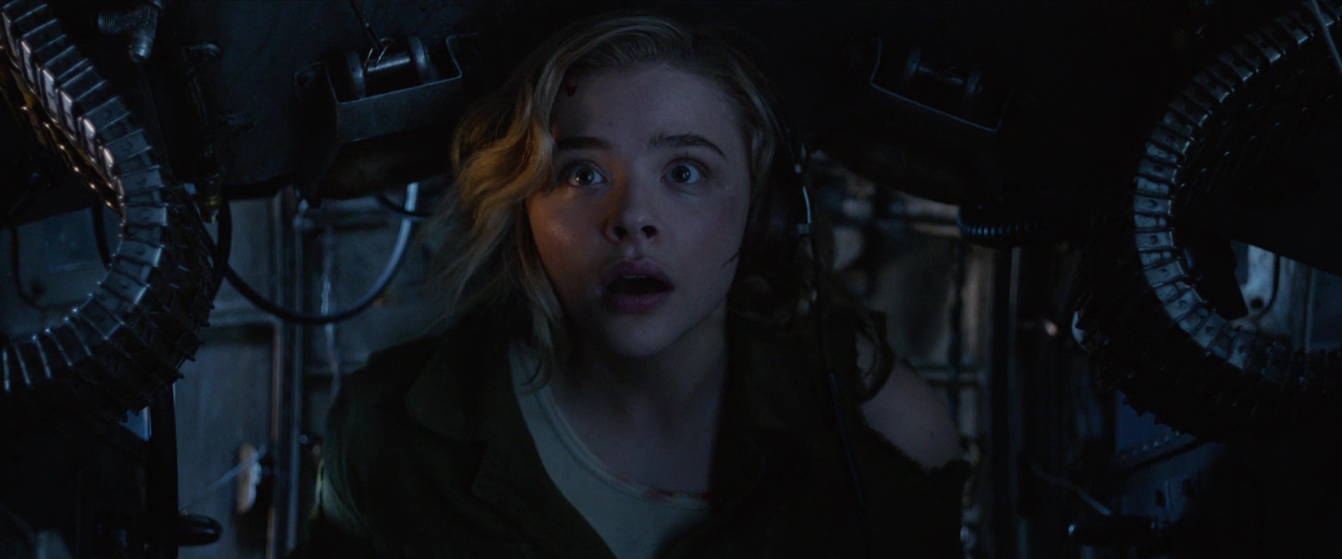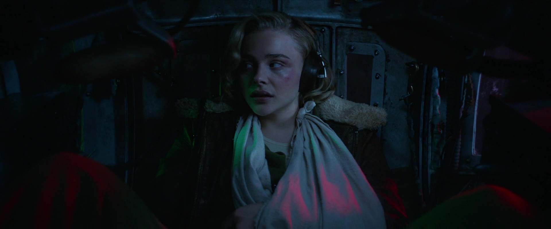 Un quasi huis clos dans la tourelle d’un avion de la seconde guerre mondiale pendant un trajet avec toute une bande d’officiers divers, et une jeune femme, Maude Garrett, transportant un coli important et top secret, lors d’une nuit qui s’annonce mouvementée, avec la possible présence d’ennemis dans la zone, mais également d’un monstre rodant autour de l’appareil, en plein vol. Et d’ailleurs, au début, malgré la présence d’une écriture pas fameuse et de personnages catastrophiques, j’ai voulu y croire. La mise en scène n’est pas honteuse, le score musical tout au synthé n’a pas franchement sa place ici mais donne un ton réellement prenant. Et puis, dés le décollage de l’avion, ce quasi huis clos dans une tourelle, cet endroit minuscule, ça a finalement quelque chose d’assez prenant. Surtout que malgré les nombreuses faiblesses d’écritures, Chloë Grace Moretz y croit et fait ce qu’elle peut. Si l’on a donc envie rapidement de jeter à la poubelle les échanges entre les personnages, effectués la plupart du temps via radio, l’ensemble tient la route et à de quoi intriguer, surtout que les effets spéciaux sont bien fichus, tellement que l’on se doute bien que c’est du fond vert, que l’actrice n’est pas réellement dans un avion en plein vol, mais les effets sont bons. Pareil pour la créature, que l’on voit au départ furtivement. Puis tout s’écroule. La seconde partie du métrage est une réelle catastrophe. La barre des 45 minutes change radicalement le métrage, qui décide alors de se la jouer bad-ass avec son personnage principal, à éliminer les uns après les autres les personnages secondaires (ce ne sont que des hommes après tout), et surtout qui se prend affreusement au sérieux alors que ce que le métrage nous propose est d’un ridicule sans nom.