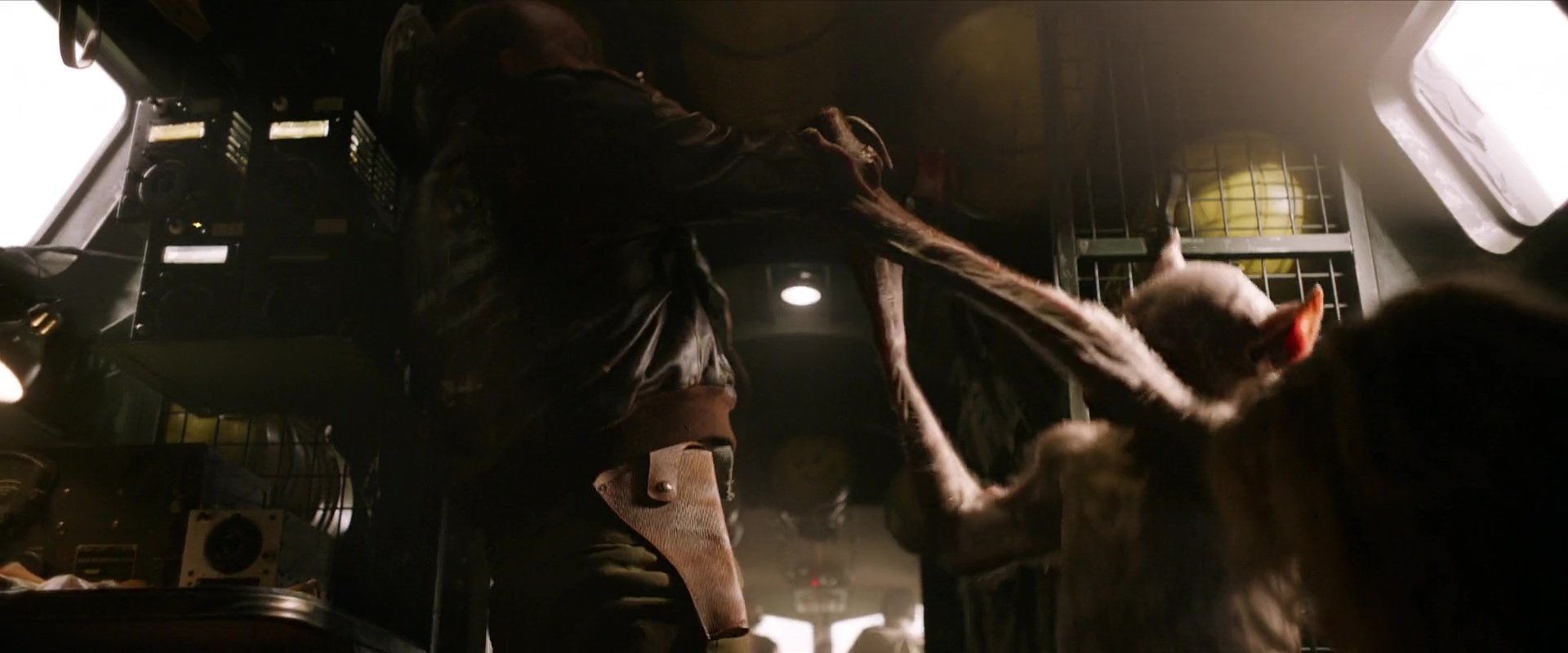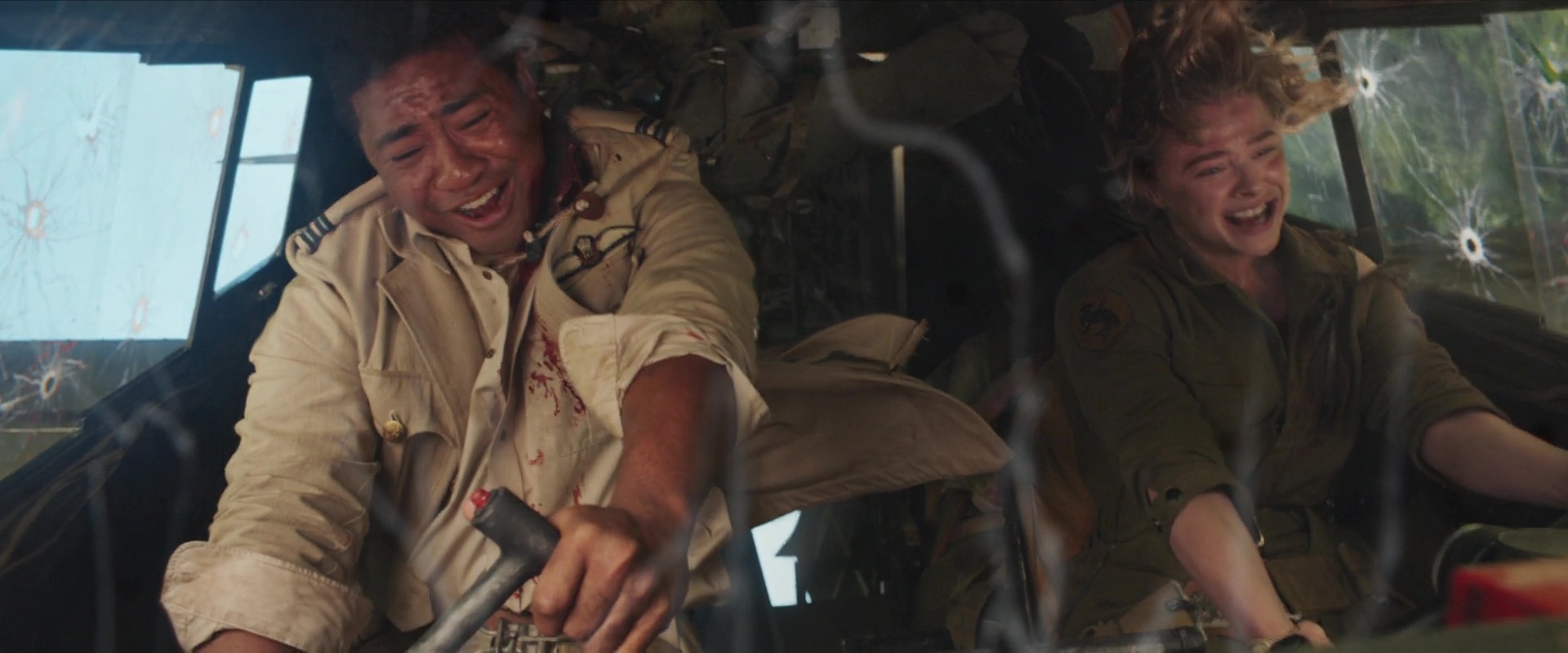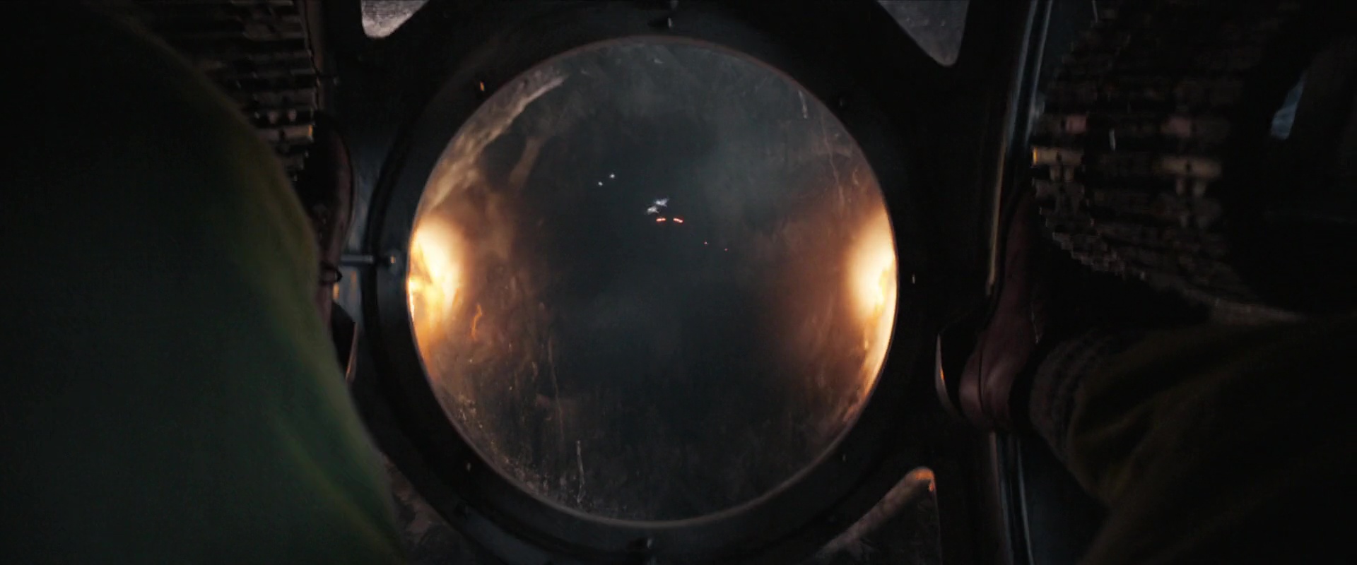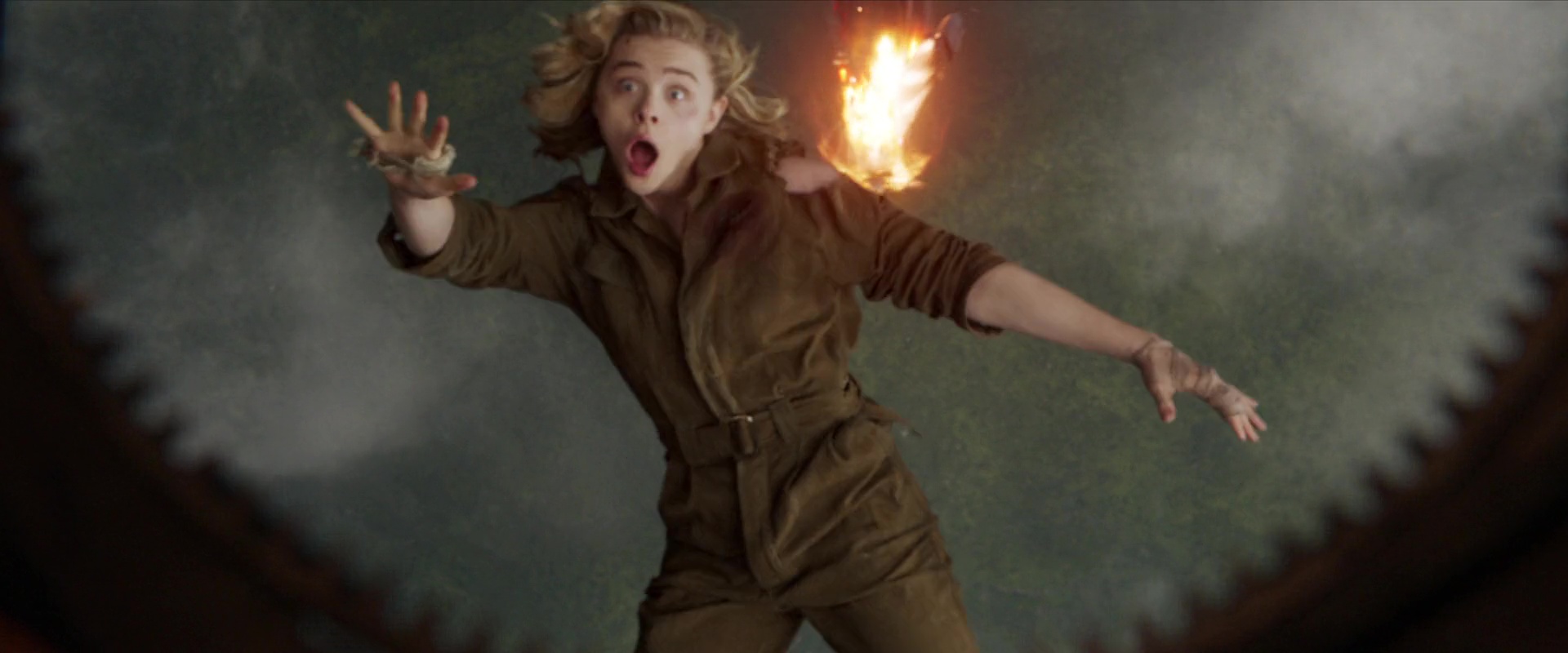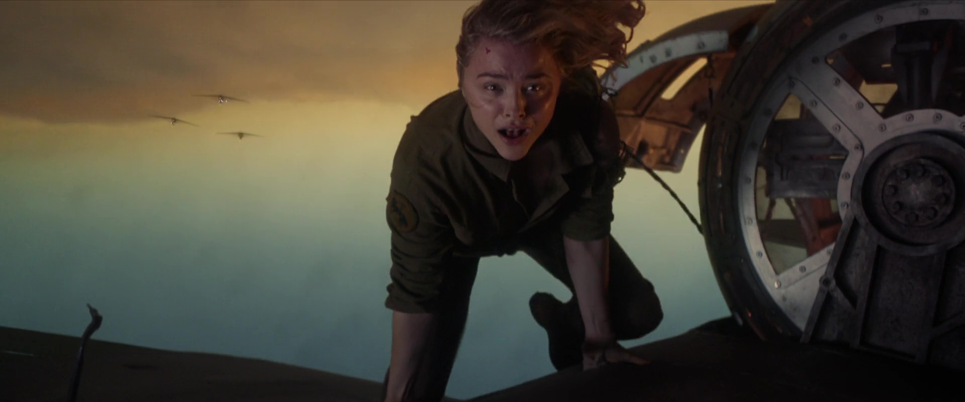 Un quasi huis clos dans la tourelle d’un avion de la seconde guerre mondiale pendant un trajet avec toute une bande d’officiers divers, et une jeune femme, Maude Garrett, transportant un coli important et top secret, lors d’une nuit qui s’annonce mouvementée, avec la possible présence d’ennemis dans la zone, mais également d’un monstre rodant autour de l’appareil, en plein vol. Et d’ailleurs, au début, malgré la présence d’une écriture pas fameuse et de personnages catastrophiques, j’ai voulu y croire. La mise en scène n’est pas honteuse, le score musical tout au synthé n’a pas franchement sa place ici mais donne un ton réellement prenant. Et puis, dés le décollage de l’avion, ce quasi huis clos dans une tourelle, cet endroit minuscule, ça a finalement quelque chose d’assez prenant. Surtout que malgré les nombreuses faiblesses d’écritures, Chloë Grace Moretz y croit et fait ce qu’elle peut. Si l’on a donc envie rapidement de jeter à la poubelle les échanges entre les personnages, effectués la plupart du temps via radio, l’ensemble tient la route et à de quoi intriguer, surtout que les effets spéciaux sont bien fichus, tellement que l’on se doute bien que c’est du fond vert, que l’actrice n’est pas réellement dans un avion en plein vol, mais les effets sont bons. Pareil pour la créature, que l’on voit au départ furtivement. Puis tout s’écroule. La seconde partie du métrage est une réelle catastrophe. La barre des 45 minutes change radicalement le métrage, qui décide alors de se la jouer bad-ass avec son personnage principal, à éliminer les uns après les autres les personnages secondaires (ce ne sont que des hommes après tout), et surtout qui se prend affreusement au sérieux alors que ce que le métrage nous propose est d’un ridicule sans nom.