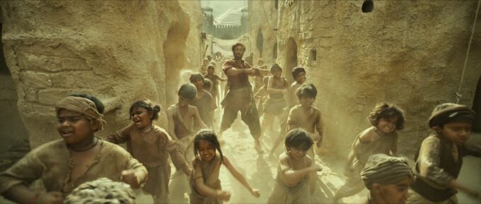 Enfin ça, c’est au début, car très rapidement, Shamshera et ses hommes sont enfermés, dépossédés de tout, et l’homme meurt après une tentative d’évasion faisait presque penser à The Dark Knight Rises, avec escalade impossible à la clé. Cette première demi-heure, elle est intéressante, puisque prenant le spectateur à contre-pieds, nous donnant l’opposé de ce que l’on attend de lui, avec un certain savoir-faire. Shamshera, le film, semble vouloir mettre en avant ses problématiques et ses personnages, semble vouloir être, la plupart du temps, plus terre-à-terre, et éviter donc le côté bigger than life et toujours plus de RRR. Sauf que passé cette demi-heure, nous voilà avec le fils de Shamshera, Balli, toujours joué par Ranbir Kapoor, et le film prend un tournant différent, plus léger, plus coloré, plus… et bien plus Indien tout simplement. Un changement facile à voir puisqu’à peine quelques minutes après l’introduction de ce nouveau personnage, nous avons droit à notre première chanson, avec chorégraphies à la clé. L’histoire elle reste prévisible et cousue de fil blanc : Balli va suivre les traces de son père, parvenir à s’évader du fort, et se mettre à voler les Anglais afin de racheter la liberté de son peuple. Et pourquoi pas, une histoire simple, un héros qui a une motivation très rapidement établie, un méchant certes bien stéréotypé et qui en fait des caisses, et bien entendu, une magnifique Indienne qui chante et qui sera là pour amener un peu de douceur et de romance dans ce monde de brute. Mais Shamshera, même si la vision s’avère sympathique, se retrouve alors à foncer dans plusieurs pièges. Le premier, c’est que malgré son intrigue se déroulant dans les années 1890, son côté historique avec les colons Anglais, bref, une fresque épique avec vengeance familiale qui aurait pu justifier sa durée conséquente de 2h39, et bien il n’en est rien. L’intrigue va parfois trainer en longueurs, déjà la faute à l’une des caractéristiques principales du cinéma Indien, à savoir, ça chante et ça danse. Ce qui en soit ne me dérange absolument pas.