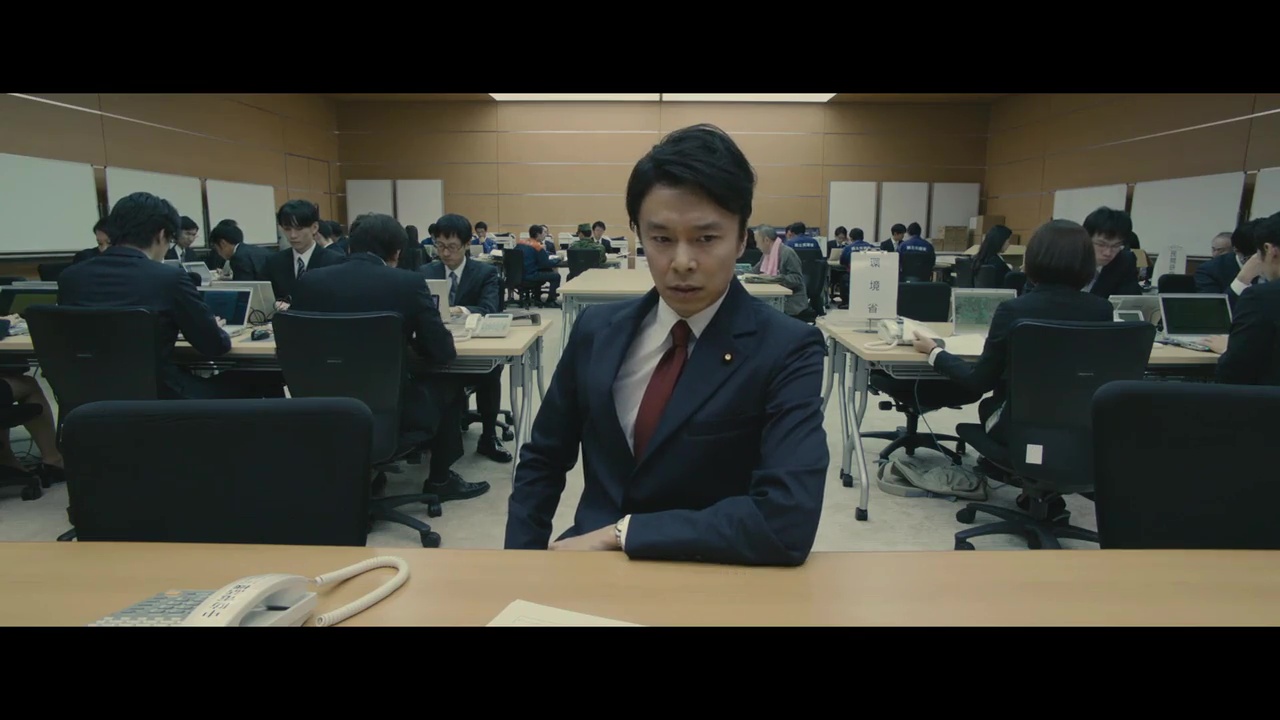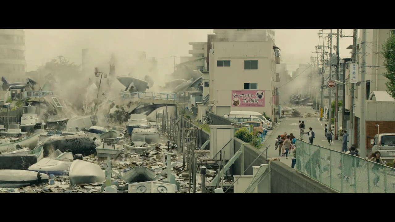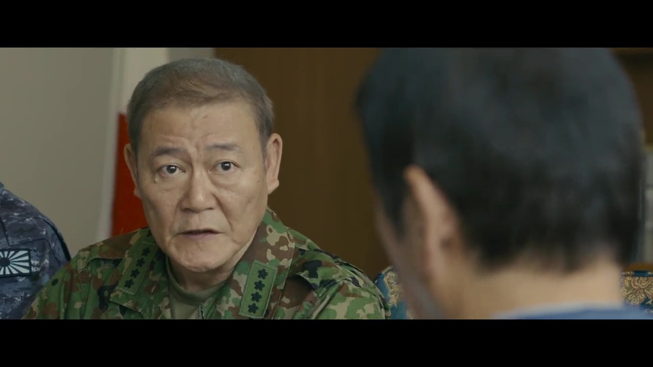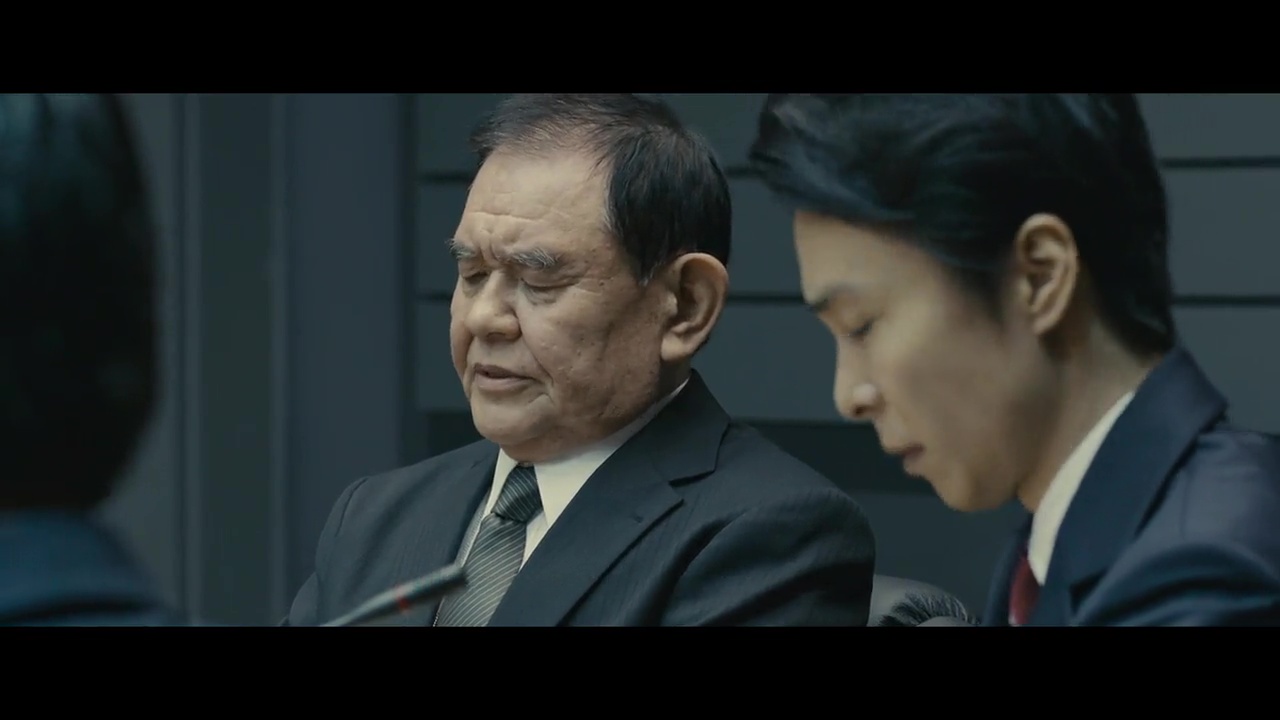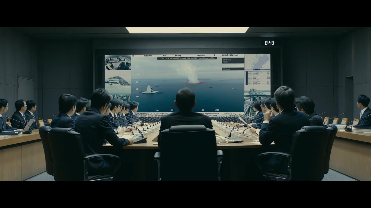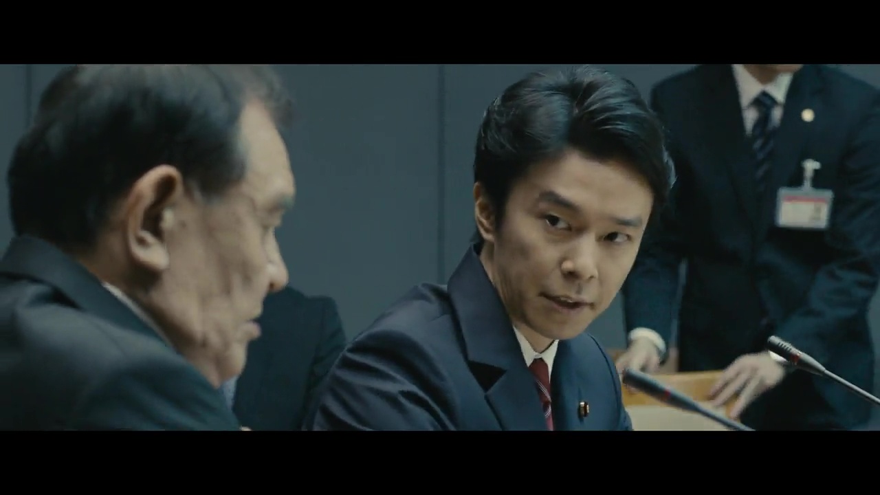Oui, car Godzilla, à la base, en 1954, représentait la peur du nucléaire, de la bombe atomique. C’était le traumatisme de la guerre, d’Hiroshima. Faire réapparaître Godzilla en 2016 a une toute autre signification, puisque oui, le Japon d’aujourd’hui a son dernier traumatisme : Fukushima. Et même si la catastrophe n’est que vaguement évoquée, on sent son poids sur tout le film. Bien vu Shin Godzilla. Mais ça donc, c’est sur le papier, car à l’écran, ce nouvel opus fait parfois des choix étranges, si bien que l’on pourrait résumer ce film par « Godzilla contre la politique du Japon ». Oui, sur plus de la moitié du film, on passera notre temps à regarder des discussions entre politiciens, écologistes, scientifiques et militaires. Comment le Japon réagit en cas de situation de crise semble être la priorité des créateurs du film. Et il faut avouer que la plupart du temps d’ailleurs, ça fonctionne, le métrage mettant pas mal d’humour dans le métrage pour se moquer ouvertement de tout ça. Et pour faire jouer tous ces personnages, mais mon dieu quel casting. Un casting énorme, tellement énorme que tous les citer est impossible (ou me prendrait un paragraphe entier). Du bien grand monde, même si parfois juste pour de très très courtes apparitions. Si bien qu’à part véritablement deux ou trois personnages en avant, le reste est très limité, on les voit, ils parlent un peu, puis les voilà déjà hors du film. On pensera par exemple à Osugi Ren en premier ministre disparaissant (logiquement lui) passé la moitié du film, ou même à Tsukamoto Shinya venant faire coucou et dire quelques phrases.
