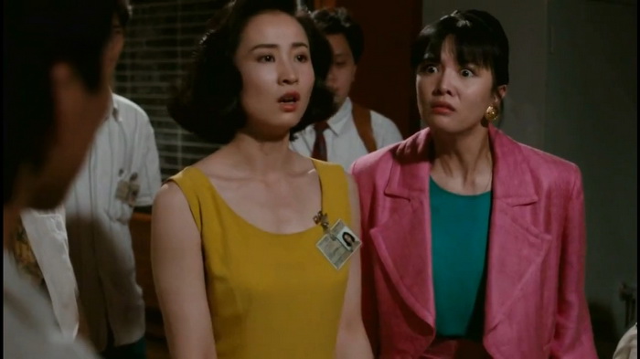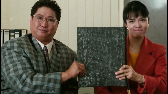 Mais selon moi, le passage le plus incompréhensible reste ce moment en début de film où il est question d’un quiproquo insoutenable et parfaitement anxiogène, sans que cela ne soit un choix artistique volontaire ! A un instant du film, en échappant aux assassins, Hung met KO sa collègue et concurrente (ce sont des choses qui arrivent en entreprise). Il la cache sur le toit pour être à l’abri en attendant qu’elle se réveille. Celle-ci finit par rouvrir les yeux et par un sentiment de désorientation et une animosité évidente envers Hung, se persuade qu’il l’a violée. Ouille. Le viol n’est pas vraiment une source si efficace de plaisanterie, donc le quiproquo a un goût amer et carrément acide. Mais c’est du cinéma beauf cantonais de l’époque, donc on laisse couler en sachant que la volonté était simplement de créer une énième situation risible de malentendu. Sauf que non, le film a l’idée incroyablement indélicate d’accentuer cette séquence, en allant jusqu’à faire en sorte que la collègue aille porter plainte au commissariat et que tout le monde débatte de la véracité de l’accusation. Donc d’un coup l’intrigue principale décide de s’arrêter pour nous faire le procès de Hung en tant que potentiel violeur, et c’est insoutenable. Pourquoi faire ? Encore une fois le but était sans doute de rire de sa malchance mais on franchit tout de même un cap très douteux ! Le personnage ne se justifie même pas vraiment, comme s’il avait été accusé d’une banalité et que s’en défendre serait une perte de temps et d’énergie. Et celle qui s’imagine avoir été violée est tristement réduite à une mégère malveillante qui veut seulement le dénigrer et réaffirmer son statut de femme forte après cette simple humiliation. Le spectateur connaît la réalité de la situation, et il sait que Hung est innocent mais que la femme en question pense réellement avoir subi cet acte. Et personne ne réagit correctement dans le film, la parole de la victime est remise en cause, minimisée, caricaturée… On la réduit à un physique, pas assez belle pour être crédible en victime de viol, trop agitée pour qu’on ait envie de la croire. Mais quelle horreur ! Et cerise sur le gâteau, ce personnage féminin finira à l’hôpital… Et cherchera avec l’aval de sa mère, à séduire l’homme qu’elle pense encore être son violeur parce que diminuée et au physique désormais accidenté personne d’autre ne voudra plus jamais d’elle. C’est une catastrophe. J’essaye à chaque fois de remettre les œuvres dans leur contexte, en acceptant leurs maladresses comme étant les résultantes d’une génération passée encore trop aveugle à bon nombre de problèmes. Mais là c’était trop pour moi, c’est de la culture du viol dans tout ce qu’elle a de plus nocif et révoltant. Heureusement tout ce passage est très secondaire à l’intrigue du film, mais il reste atrocement long et détestable. Aussi futile pense-t-il être.