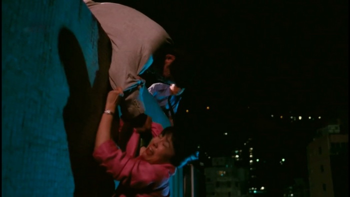Le film s’ouvre sur un moment de comédie absurde, justement digne d’un mo lei tau. Avec cette conversion stérile et non-sensique du patient avec son psy qui confond ses mots dans un cabinet-bateau au parquet glissant. La scène a néanmoins le mérite de nous poser les bases du personnage principal qu’est Hung : c’est un vendeur habitué à mentir pour vendre ses produits, si bien habitué qu’on ne le prend plus au sérieux dans son intimité. S’ensuivent des moments de comédie légèrement longuettes mais amusantes. Les interactions font très années 80, avec une femme indépendante comme adversaire, des blagues poussives sur l’homosexualité, des clins d’œil populaires et un peu beauf… le tout baignant dans une atmosphère innocente et légère enrobée d’un petit morceau de piano enfantin. On est en terrain connu, et malgré le caractère légèrement ringard il faut reconnaître que c’est efficace ! Après cette quarte heure de comédie mainstream à l’hongkongaise, l’intrigue du film se lance enfin via un assassinat dans lequel Hung se retrouve mêlé. Pas besoin de justifier cette situation plus que ça, ni de trouver un prétexte alambiqué ; le personnage se retrouve tout simplement au milieu d’une rixe lorsqu’elle se déclenche en pleine rue. Première scène de combat du film, nerveuse et assez tendue du fait de sa gravité : c’est un attentat meurtrier. Hung en tentant de se défendre découvre le visage d’un des assassins, et va devenir sa prochaine cible afin d’éviter qu’il le dénonce. Mais de toute manière, il aura beau raconter sa nouvelle mésaventure, personne ne voudra le croire…