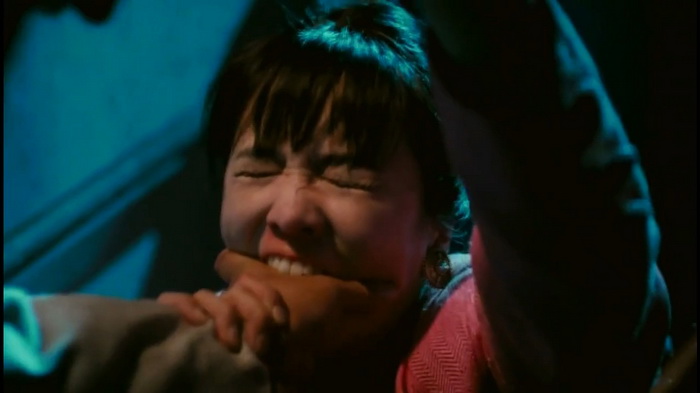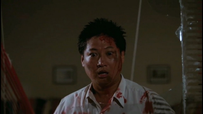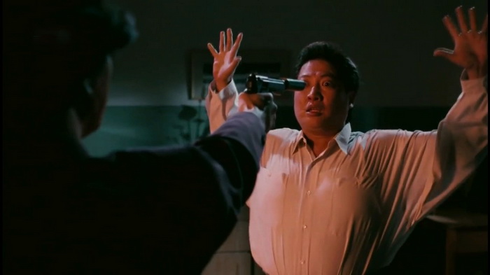 On se retrouve donc dans le schéma habituel chez Sammo, qui est de présenter un personnage simple, naïf et naturellement bon (autant que possible) sur qui le sort s’acharne. Mais ici la menace prend une autre dimension, on la sent plus angoissante et grave. On est habitué chez Hung à voir cette pauvre victime subir nombre d’injustices et être mêlée aux pires complots malgré son innocence évidente. Cette fois-ci la situation est plus palpable, plus simple dans un sens, donc plus effrayante ! Le tueur va devenir obsédé à l’idée de tuer son témoin, jusqu’à en faire une véritable psychose. Dans l’idée ça devrait créer une atmosphère terrifiante mais le jeu de Jacky Cheung est beaucoup trop grossier et expressif pour une quelconque crédibilité horrifique. Son acting se limite quand même fortement à des yeux exorbités et des grimaces dignes de son apothéose dramatique dans Une Balle dans la Tête. Tout ça tend plutôt son obstination criminelle vers le burlesque, et ça n’est pas un mal. D’autant que même si le jeu de Cheung reste à désirer (comme “presque” toujours…), son personnage n’est pas dénué d’intérêt. On ressent toute sa folie et son caractère perturbé. Il forme un très chouette duo avec l’autre assassin joué par Lam Ching-Ying, plus sage et lui aussi victime de l’imprévisibilité de son partenaire. Cela permet à des personnages pourtant malveillants et immoraux d’avoir un petit côté attachant, ça fonctionne plutôt bien. Parce que même si l’ambiance est assez stressante et que les combats sont violents lorsqu’ils y sont mêlés, le binôme est aussi une source non négligeable de gags et de légèreté. Comme cette scène très drôle chez le psy avec un quiproquo digne d’un théâtre de boulevard. C’est un dosage étonnamment bien maîtrisé entre sentiment de menace anxiogène et détachement cocasse. Cette ambivalence est clairement une des réussites principales du film.