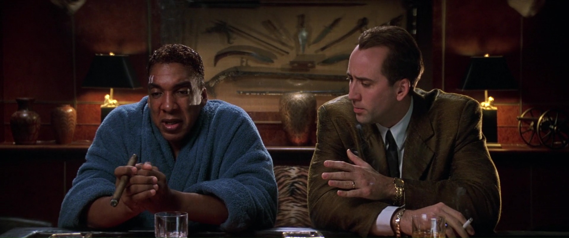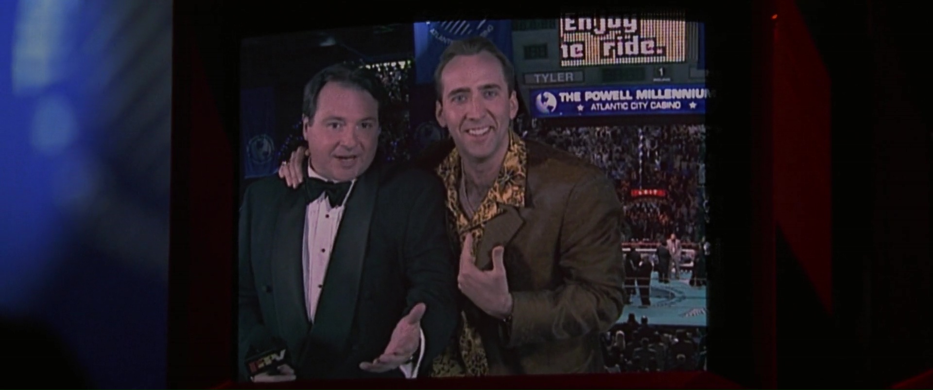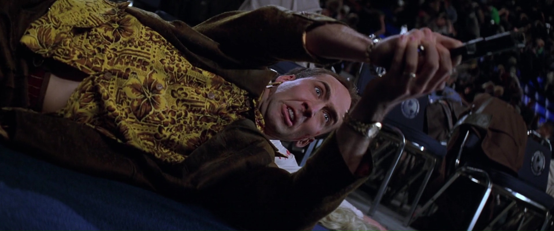 Snake Eyes est donc à tous les niveaux du pur De Palma, et encore plus avec sa scène d’ouverture bien connue, un plan séquence de près de 20 minutes. Bien entendu, tout le monde le sait aujourd’hui, et cela se remarque notamment à un moment très tôt, mais le plan séquence est faux. Néanmoins, au moins 12 minutes de ce fameux plan est un vrai plan séquence filmé à la Steadycam. Et sachant les incessants déplacements de caméras, le nombre de figurants, d’acteurs présents, les dialogues, la gestion des éclairages, des techniciens, la prise de son… et bien c’est un coup de maître, surtout que cette très longue scène met en place absolument tout le film puisque nous présentant l’intégralité des personnages, le lieu de l’action, et surtout le meurtre qui va amener l’intrigue. La caméra, et donc par extension le spectateur devient un acteur à part entière du métrage, avec un point de vu volontairement faussé, puisque passé ce plan séquence, Rick (Nicolas Cage) va mener l’enquête sur les événements ayant menés au meurtre, et reviendra donc inlassablement en flashback sur ce fameux plan séquence, mais ce coup-ci vu depuis d’autres angles. C’est bien simple, le point de vu est un des éléments principaux du métrage. Un peu à la manière de Carpenter dans Ghosts of Mars quelques années plus tard (toutes proportions gardées, je n’aime pas Ghosts of Mars), De Palma joue sur le point de vu, toujours différent puisque les flashbacks seront toujours racontés par de nouveaux personnages, et l’intérêt est simple. On peut tout simplement croire ce qu’on nous raconte, mais en soit, avec un meurtre ayant eu lieu et un complot étant derrière tout ça, ce que le réalisateur décide de nous montrer n’est pas forcément la vérité. Les vingt premières minutes en plan séquence sont donc les faits, tandis que les nombreux flashbacks, souvent dans un style cher à De Palma (l’écran splité, le plan séquence, la vue subjective) ne sont que des points de vu différents, et surtout, des « on dit ».