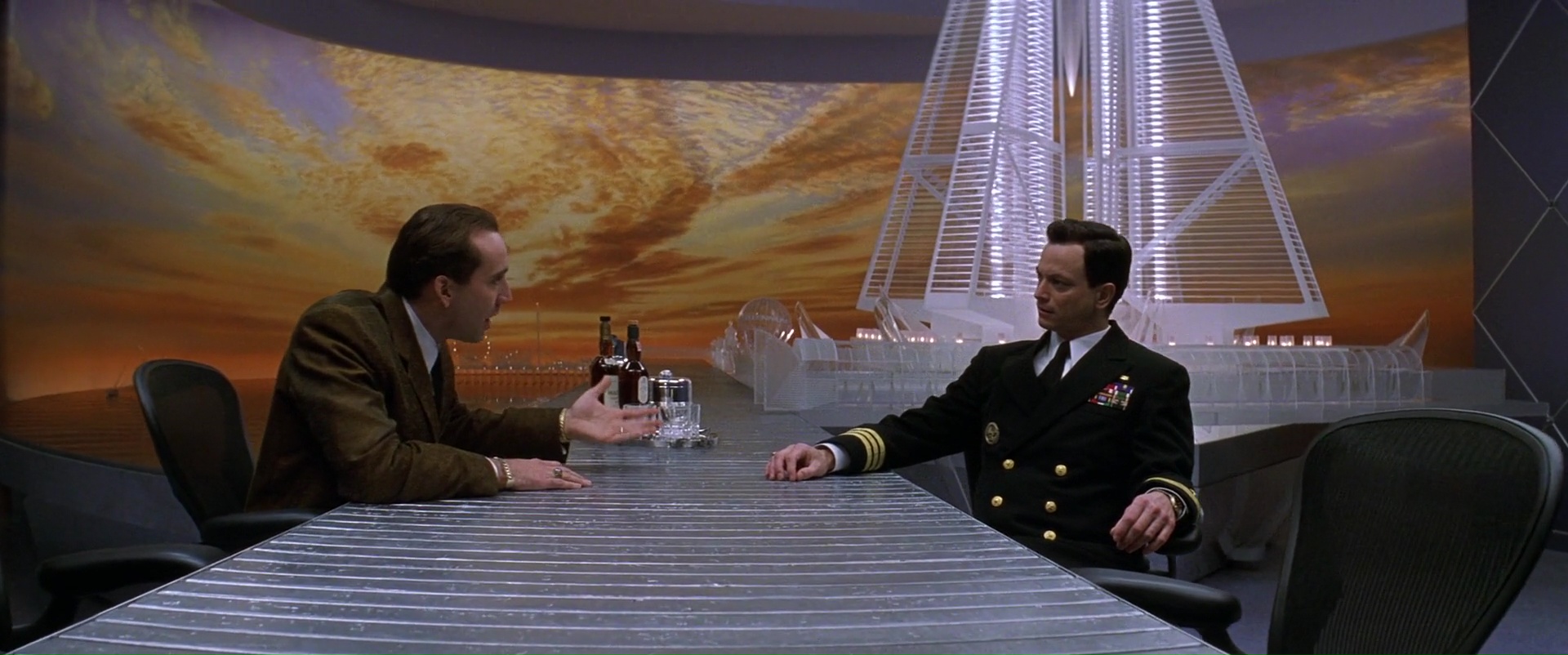 Snake Eyes est donc clairement un film avant tout visuel dans sa structure et dans sa narration, rappelant d’ailleurs une des meilleures scènes de Mission Impossible (quand Ethan Hunt imagine dans sa tête les événements du début après ses retrouvailles avec un personnage clé), mais en poussant l’intégralité du concept à l’extrême. La mise en scène est donc un élément clé du film et de son ADN en quelque sorte, et est un sans faute. Quand forcément, l’intrigue tient la route et que les acteurs sont bons, le métrage devient passionnant. Nicolas Cage est excellent en flic légèrement ripou qui ne cherche qu’à se faire une place, Gary Sinise campe un bon agent du gouvernement tandis que Carla Gugino, bien qu’en arrière plan pendant plus de la moitié du film, apporte une part de féminité, en plus de la vérité. Seule petite ombre au tableau en effet, le final, parfois un peu précipité, parfois un peu bancal et facile. Surtout que comme dit plus haut, le final a été en parti retourné, et quelques rapides éléments de la fin originale sont toujours dans le récit, lorsque l’on apprend qu’un personnage a faillit se noyer, ou que l’on voit une grande vague s’abattre sur un véhicule à l’extérieur. Un élément qui n’a pourtant absolument aucune répercussion sur le reste de l’intrigue. Du coup, on a souvent un peu l’impression que tout le film monte petit à petit en puissance pour nous amener à un grand final, qui n’a pas véritablement lieu. Certes le métrage évite au moins une scène trop impressionnante comme pour le final de Mission Impossible, mais il manque malgré tout un petit quelque chose. Rien de catastrophique non plus, puisque le métrage demeure malgré tout un excellent divertissement, en plus d’être tout simplement un excellent film maîtrisé sur quasiment toute la ligne. Le déclin de De Palma n’avait pas encore lieu, contrairement à ce que beaucoup voulaient faire croire.