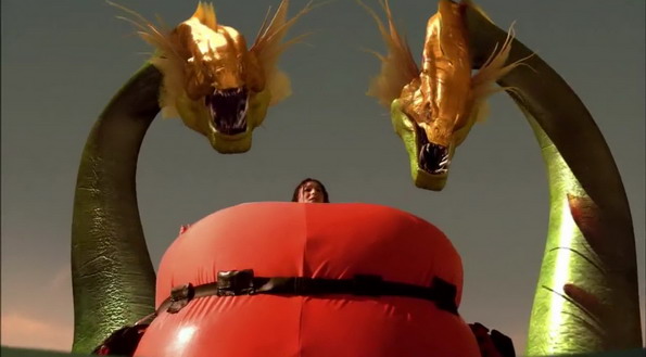 Trop d’humour à la con et de punchlines débiles. Certaines font certes mouche, mais l’humour pour enfants est quelque chose d’assez subtil si on veut qu’il plaise aussi aux plus grands. Et ce n’est pas forcément le cas ici. Le duo de jeunes acteurs est toujours aussi mauvais, tout particulièrement le jeune Daryl Sabara qui frôle la catastrophe à la moindre phrase prononcée. Le reste du casting semble être venu ici pour s’amuser, façon cour de récréation, sauf qu’ils ont semble-t-il oublié qu’il fallait également amuser le public. Mais ce qui marque le plus dans le film, dans le mauvais sens du terme, c’est vraiment son visuel. Outre son côté kitchos qui est dans la continuité du premier et qui en plus, comme dit plus haut, veut rendre ici hommage au créateur d’effets spéciaux Ray Harryhausen (la scène avec squelettes rend hommage à celle de Jason et les Argonautes), le design des créatures hydrides créées par le savant fou nous procure ce sentiment de foutage de gueule. Déjà, entre le gorille araignée ou le serpent scorpion, on a l’impression de se trouver devant ces mix improbables (Piranaconda, Sharktopuss,…) que les productions Syfy actuelles nous présentent de manière régulière. Sauf que dans le film à 38M$US de budget de Rodriguez, elles ne sont pas beaucoup mieux designées et animées que dans une production lowcost à 1M$US, et c’est ça qui devient rapidement irritant. Nous ne parlerons pas du porlican, qui comme son nom l’indique est un mix entre un porc et un pélican, qui nous aura provoqué un fou rire nerveux mixé à de l’exaspération à chacune de ses apparitions, car il aura eu le mérite d’amuser les enfants. Oui, visuellement c’est hideux, mais dites-vous que ce n’est rien comparé au troisième opus…