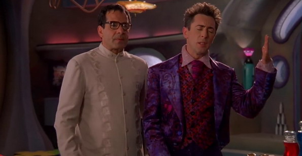 Passé la phase d’introduction avec la classique présentation des personnages, la mise en place de l’intrigue et l’apparition de l’élément déclencheur, Spy Kids part dans un nawak complètement assumé pour peu qu’on choisisse quelle lecture du film on a envie d’avoir, premier degré ou second degré. Les gags et les situations grotesques vont s’enchainer, les idées toutes plus farfelues et barrées les unes que les autres vont fuser, et ça ne va jamais s’arrêter. Tantôt navrants, tantôt hilarants, les acteurs sont en roue libre totale, jouant eux aussi la carte du second degré sans jamais avoir peur de se ridiculiser. Et c’est une des forces du film, arriver à aligner un casting trois étoiles, avec des cameos de luxe, et leur faire faire n’importe quoi sans qu’aucun ne nous donne l’impression de se dire « Mais qu’est-ce que je fous ici !?! ».
