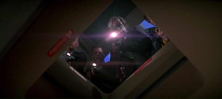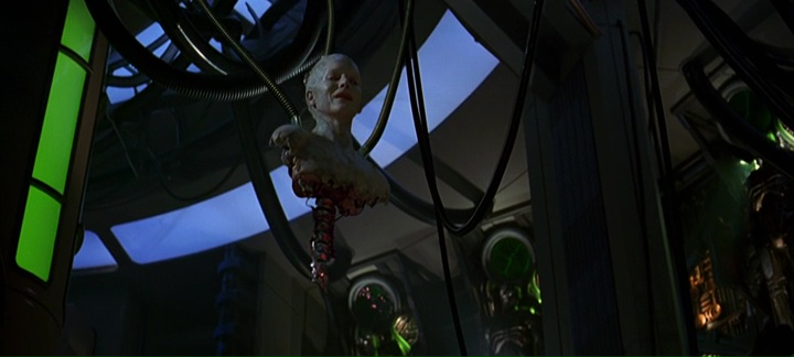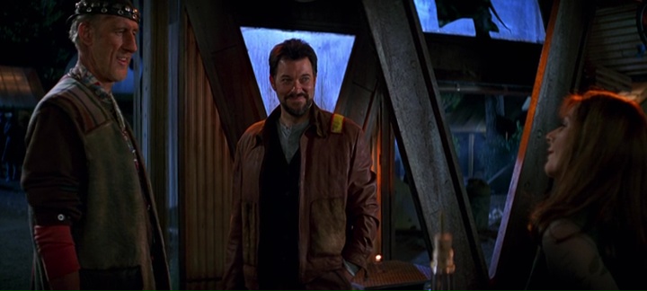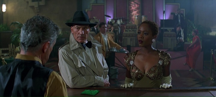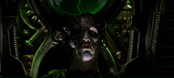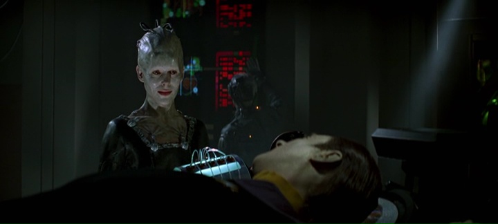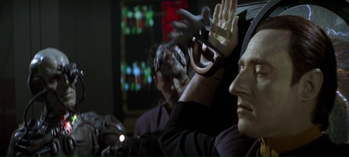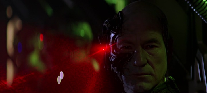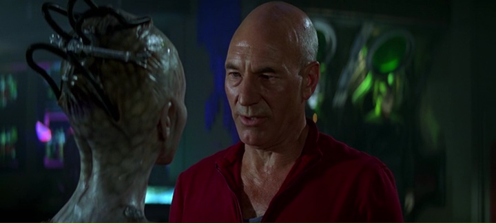 Les Borg attaquent donc la Terre, et voyagent dans le temps pour retourner dans le passé et empêcher la première rencontre entre les humains et les vulcains, en infectant la Terre. L’équipage de l’Enterprise va suivre les Borg dans le passé, et tenter de sauver, encore une fois, l’humanité. Et Premier Contact va alors se découper en clairement trois arcs narratifs, à l’intérêt différent, mais ayant chacun ses qualités. Les Borg ont infestés l’Enterprise d’un côté, et Picard (Patrick Stewart) va tenter de lutter contre cette invasion avec l’aide d’une partie de son équipe, mais également avec une humaine de cette époque alors à bord du vaisseau. Par quelques dialogues et surtout la scène d’ouverture, Picard a droit à un développement sympathique qui met alors en avant sa haine des Borg, ses êtres avec un esprit commun et qui s’adaptent. Tirer leur dessus et ils meurent. Refaites le plusieurs fois, et votre tir devient alors inutile. Oui, ils s’adaptent à chaque attaque, si bien qu’il va falloir changer de tactique assez souvent. En plus d’avoir un visuel intéressant qui tient la route, les Borg sont donc des machines assez creepy et qui donnent un aspect relativement sombre à ce nouvel opus de la saga. Et le passé de Picard avec les Borg, qui l’infectèrent apparemment dans la série, donne de la profondeur au personnage, et dans le fond même, un côté plus humain bienvenu. Un capitaine avec des failles, qui se laisse parfois aller à la colère. De l’autre côté donc, nous avons l’arc narratif de Data (Brent Spiner), cet androïde en quête d’émotions humaines. Oui, il était l’élément comique et bien raté du précédent film, et heureusement ici, l’humour est un peu mit de côté pour que son arc narratif soit réussi.