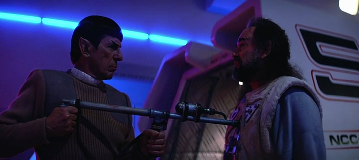 On découvre immédiatement le personnage de Sybok, mystique à souhait, ce qui n’est pas pour me déplaire, surtout que Laurence Luckinhill livre une très bonne prestation. Il faut bien ça d’ailleurs car le scénario, bien qu’ayant des tas d’idées, va parfois s’attarder sur ce qu’il ne faut pas. Sybok donc, et bien au final, on ne saura pas grand-chose de lui, de l’origine de son « pouvoir » (faire disparaître la peur des gens, leur laver le cerveau). Un poil de background, mais jamais bien poussé. Et pourtant, c’est dés que Sybok sera à l’écran que le film montrera beaucoup de potentiel. Il livre même ses meilleures scènes lorsqu’il prendra en otage l’Enterprise et tentera de laver le cerveau de son équipage, en particulier Spock et McCoy. Et c’est là que Star Trek 5 fait des chois parfois étranges, en se focalisant un peu trop longtemps sur quelques éléments peu intéressants, et en mettant de côté ses plus gros atouts. Le début en est le parfait exemple. Après la très bonne scène d’ouverture, le film nous montre l’équipage de l’Enterprise hors du vaisseau, prenant des vacances. Spock, Kirk et McCoy sont ensembles à la montagne, et le film nous offre alors quelques développements de personnages intéressants, alors que les films étaient jusque là plutôt radins à ce niveau. Au coin du feu, les personnages se confient, leur amitié prend alors un autre sens, avant que la scène parte dans l’humour, puis dans une petite chanson chantée au coin du feu. Le problème, c’est que le film s’attarde énormément sur ce genre de moments au lieu de passer à la suite, donnant au métrage un rythme assez bancal.
