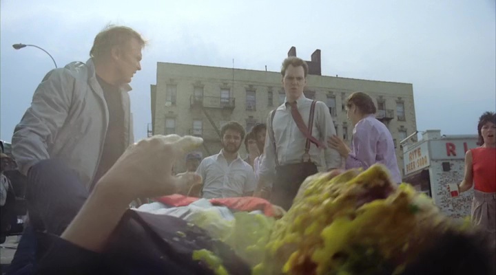 Car Street trash est loin du cinéma représentatif des années 80 qui montre une Amérique triomphante, optimiste et faisant la part belle à la grandeur du pays et au fameux rêve Américain, celle de Ronald Reagan qui aura donner un coup de boost à l’économie d’un pays plus surpuissant que jamais, mais non sans avoir abandonné une partie de sa population, des laissés-pour-compte victimes de réformes qui ne serviront pas les plus pauvres. À la manière par exemple d’ un Franck Hennelotter avec Frère De Sang, Abel Ferrara avec Driller Killer ou Jim Van Bebber avec Deadbeat By Dawn, Street Trash met en scène des marginaux tout comme dans le court métrage dont il est tiré, reprenant ainsi son essence même tout en le poussant dans ses retranchements pour arriver à la durée de 1h31. Street Trash est un titre à double sens, renvoyant non seulement au mauvais goût du film, mais aussi aux «déchets» de la société américaine. Les personnages à la rue de Street Trash ont tous leur petite histoire, certains ont tout simplement tout perdu, d’autres ont été abandonné dans leur jeunesse ou sont des vétérans du Vietnam au trauma encore prononcé. Les autres en apparence plus nantis ne sont pas plus glorieux, entre un patron d‘ une casse auto miteuse, ou vivent les clodos, obsédé à l’idée de se taper sa secrétaire, un flic dur à cuire et violent ou encore un portier à la grande gueule qui bosse pour un membre de la mafia. Car dans Street Trash, Tous les personnages sont à la fois d’une manière ou d’une autre détestables et victimes de leurs conditions, chacun contribuant à l’ambiance crade qui se dégage du métrage, en plus d’un tournage dans les rues délabrées de Brooklyn. Reste Kevin, un ado qui vie avec son frère dans la casse auto témoin impuissant de la déchéance environnante, à l’image du spectateur assistant à une suite de scènes qui donnent l’autre sens au titre du film. Street Trash parle des rebuts sans jamais fustiger la société Américaine et n’est que prétexte au mauvais goût. Ici, tout le monde est crade, un viol collectif est suivi d’un autre nécrophilique, on gerbe sur un gars qui vient de se faire passer à tabac, on pisse sur les cadavres et on coupe un zboub pour ensuite faire une partie de football américain avec.