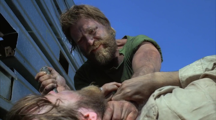 Exactement ce que l’on était venu chercher sur un tel film en fait non ? Seulement passé les quinze premières minutes, tout ça, ça passe en arrière plan, et le métrage va plutôt se focaliser d’un côté, sur la loi de la rue, avec des gangs de clochards, certains qui volent dans des supermarchés, d’autres qui poignardent des gens avec des… fémurs taillés au couteau ! La fameuse boisson Viper et l’élément vendeur du film se retrouvent carrément oubliés, pour ne revenir que dans les 20 dernières minutes du métrage. Le scénario ne raconte alors plus rien, si ce n’est nous montrer le quotidien peu recommandable de ses personnages. Car tout le monde en prend pour son grade, tout le monde est salaud. Une femme ramenée chez un clochard sera abusée par tous les « habitants » du coin, le gros bossant dans la casse de voiture veut se taper son employée, mais comme il n’y arrive pas et trouvera le cadavre de la dame, il va assouvir ses pulsions dessus. Et puis il y a Bronson, vétéran du Vietnam totalement fou qui tue des passants pour le fun, tabasse les siens, et coupe des bites au couteau. Et il y a aussi des flics, qui tabassent des témoins et leur pissent dessus. La routine. Tout cela pour arriver où ? Malheureusement, nul part jusqu’à ce que la boisson tueuse repointe le bout de son nez dans les derniers instants.